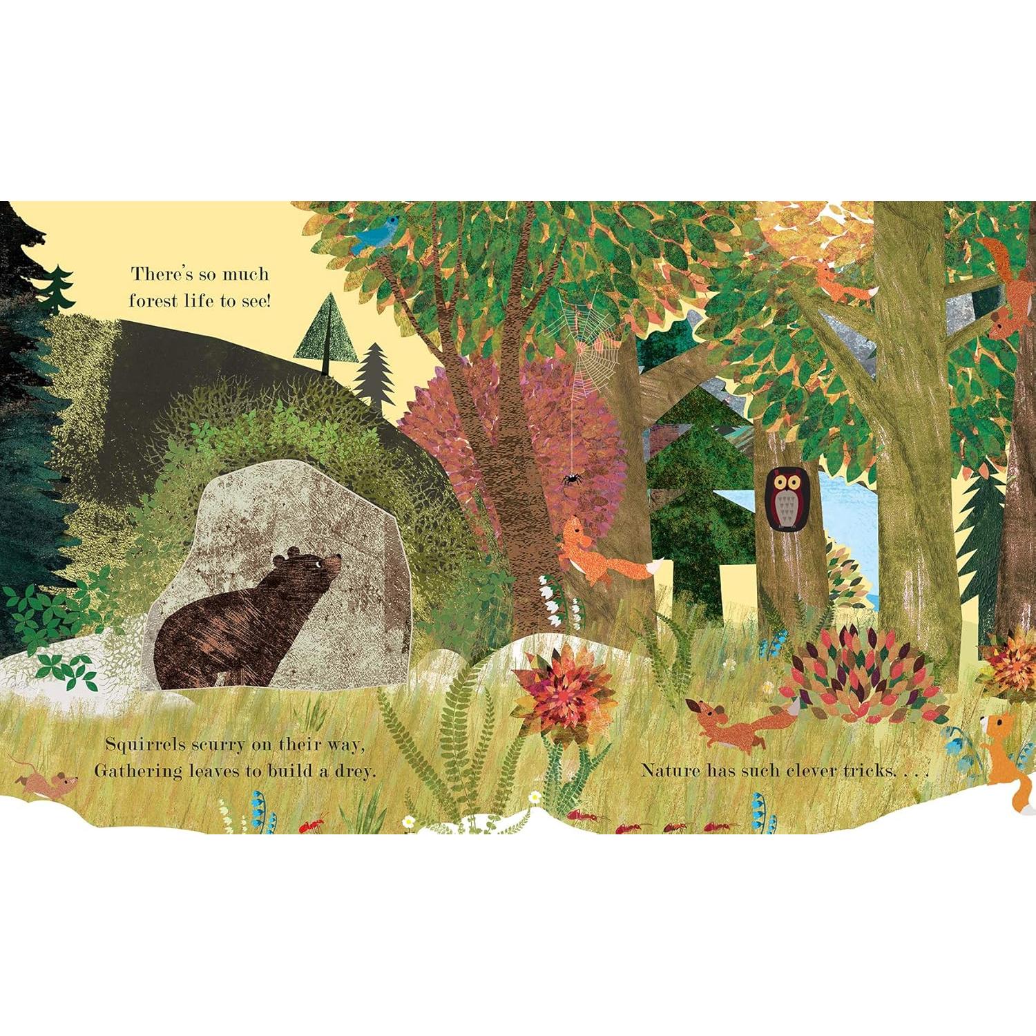 A family of bears wanders through the forest, spying all the different places animals call home, including a bird’s nest, a beaver lodge, an icy river full of fish, and a maze of rabbit burrows. Finally, as the snow falls, the bears come home to their cozy cave to hibernate, safe and warm.
