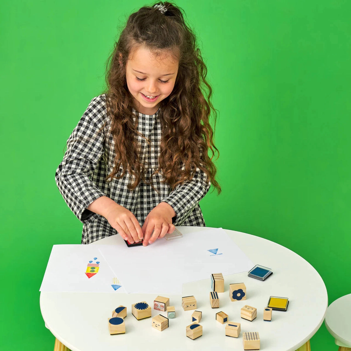 Let your kiddo's creativity soar with this graphic and inspiring stamp set. There's 18 rubber stamps with wooden backs that have different shapes, symbols, and expressions. Your child can make expressive and original artwork, greeting cards, scrapbooks, and more.