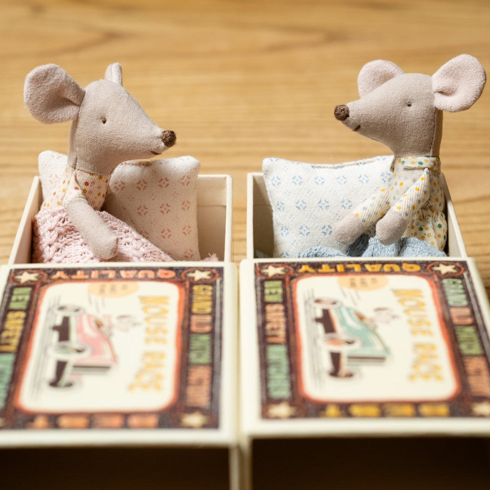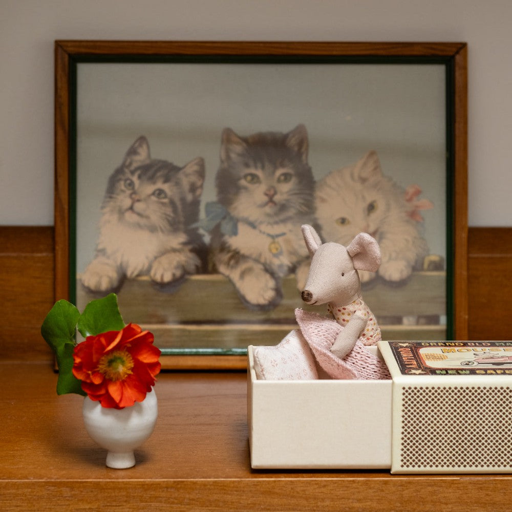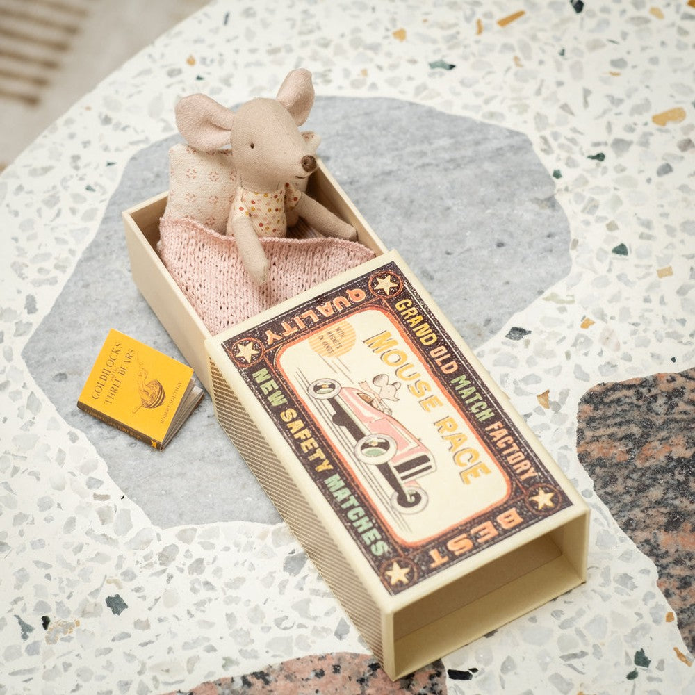 A classic Maileg item. This mouse is ready for hours of play and sleeps tight in the little matchbox. The clothes and bedlinen are made of soft fabrics with unique prints in beautiful colours. Extend the story by adding accessories to the play