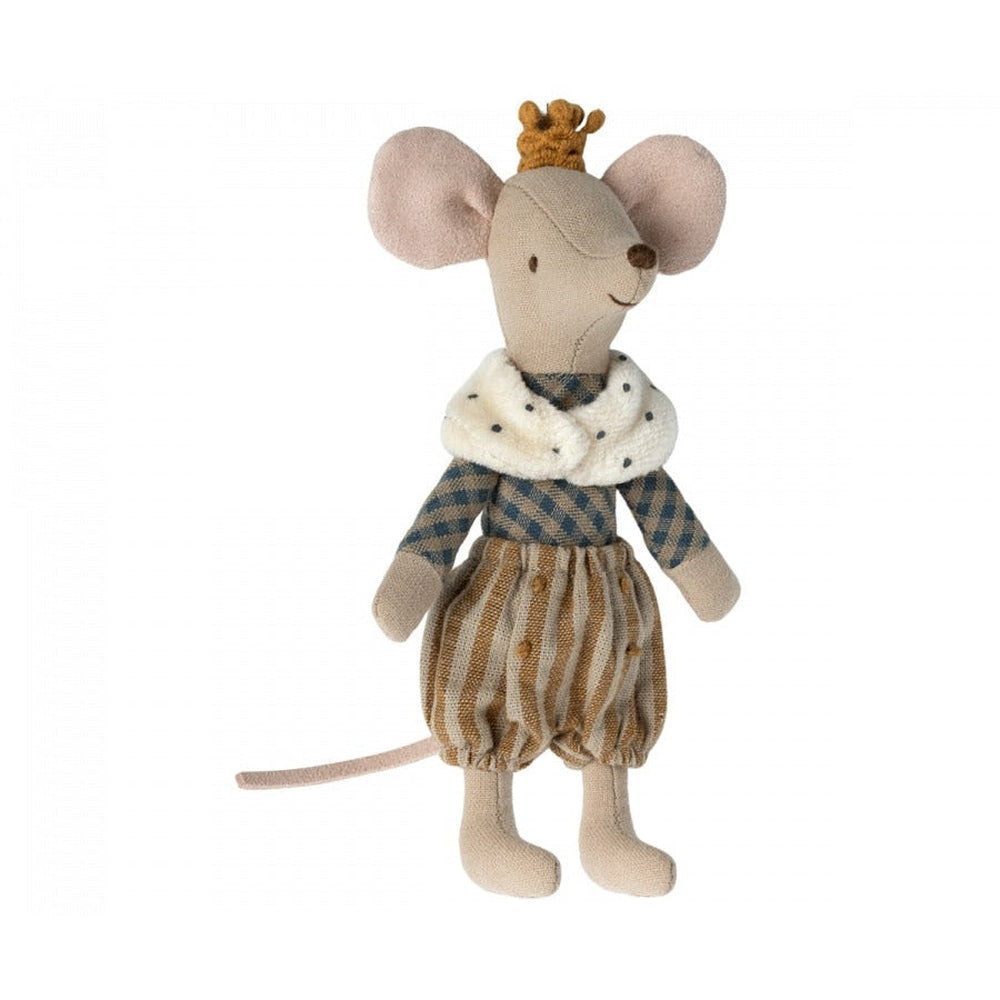 A real prince mouse in a big brother size. He is dressed in his finest clothes with beautiful details and a golden crown. He fits perfectly into the Maileg castle.