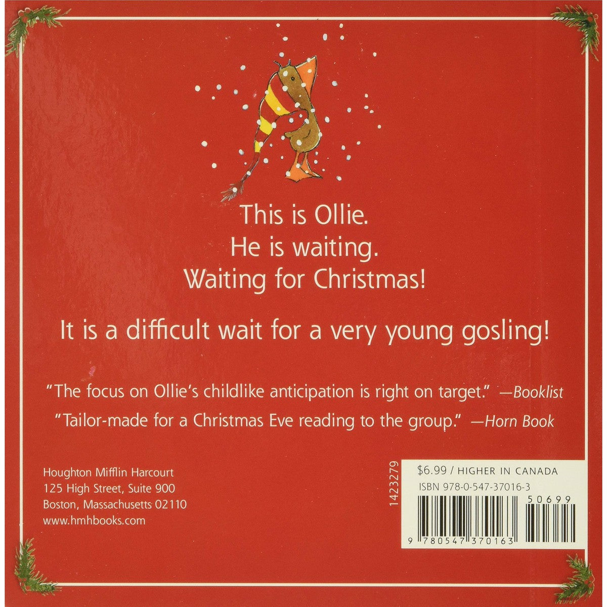 It's Christmas Eve. Gossie and Gertie hang their bright colored boots in the barn. Peedie and BooBoo hang their striped stockings in the barn. Ollie stomps through the snow. It's not easy to wait for Father Christmas Goose!