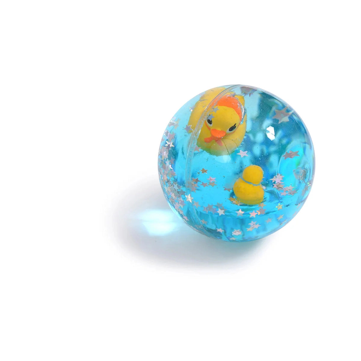 This bubbly bouncy ball is filled with colourful liquid, glittering stars, and a momma duck with duckling. Bounce the ball and watch the ducks bob around inside.