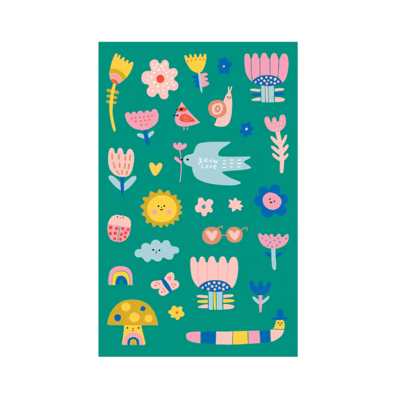 - designs feature colorful garden stickers like flowers, insects, the sun, mushrooms, and more