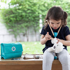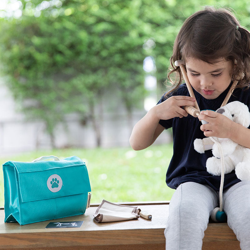 Raise a future vet and boost your kiddo's emotional intelligence, empathy, and confidence with this thoughtfully made veterinary set from Plan Toys. Included in the set is a stethoscope, a medicine bottle, a syringe, a thermometer, bandage, a soft cone, and x-ray images of a cat and a dog. Everything you need to make your (plush) pet well again comes in a handy teal-coloured cloth doctor's bag with handle and velcro closure.