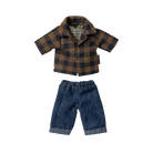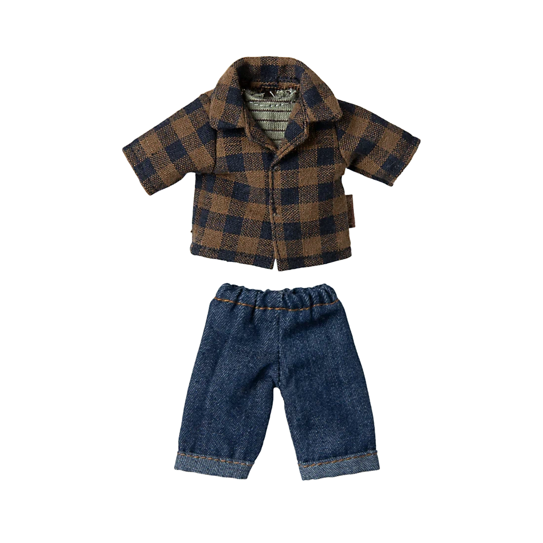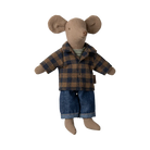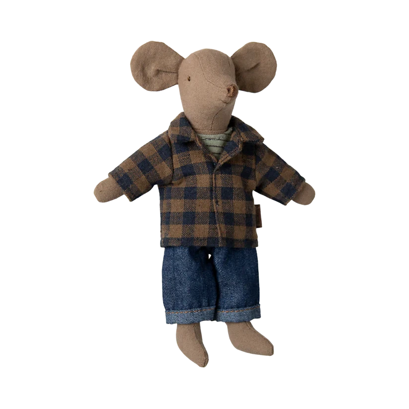 Dad mouse in light brown body fabric. He wears a checked shirt, tank top and denim pants. This mouse fits furniture and accessories in size mouse. Buy more clothes separately, clothes in size mum/dad fits this mouse.