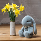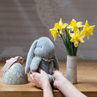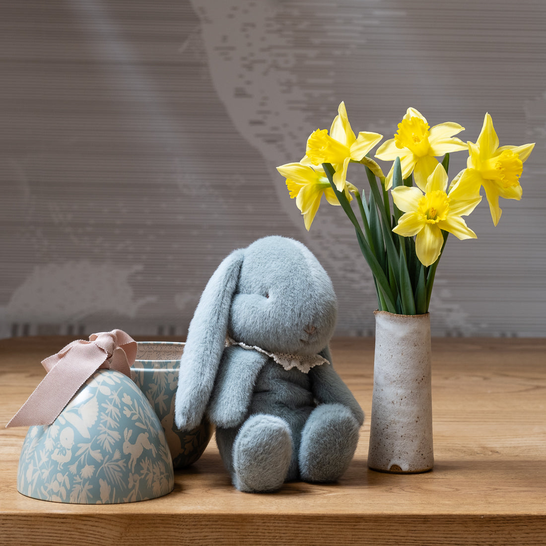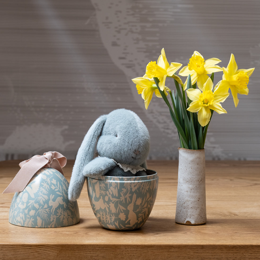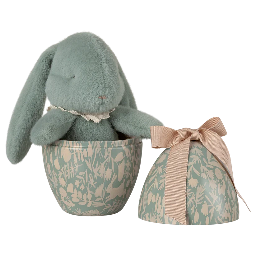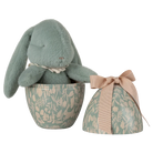 A sweet soft plush bunny with a vintage cotton collar around the neck, packed in a lovely metal egg with a beautiful print and a big soft bow on top - a perfect gift for the small ones.