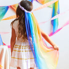 Made of soft georgette silk, this veil drapes from a silk garland adorned with matching ribbons. Hand painted rainbow silk on a stretchy lavender garland; the veil is 28 inches long and 24 inches wide and the garland is 18 inches. This veil is lovely fun at dress up time when you need to be a princess, a ghost, a bird, a bride, a fairy, and more.
