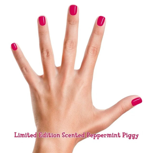 The Perfect Holiday Red (with a tiny pop of pink!). And as a bonus, it smells like Peppermint!  Available for a limited time only! The special Piggy Paint water-based formula is free of all the harsh chemicals normally found in nail polish and is fun and easy to apply.