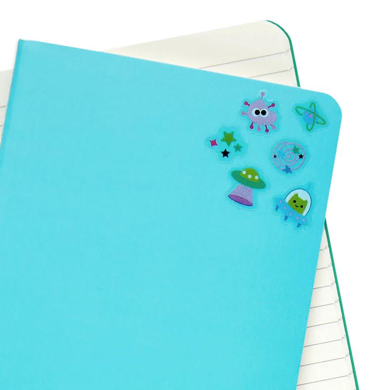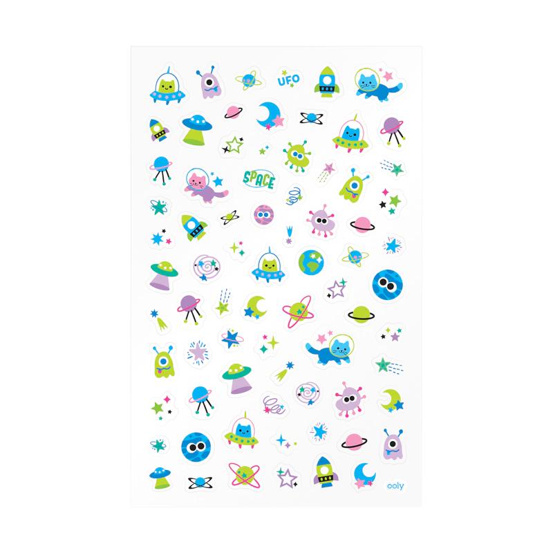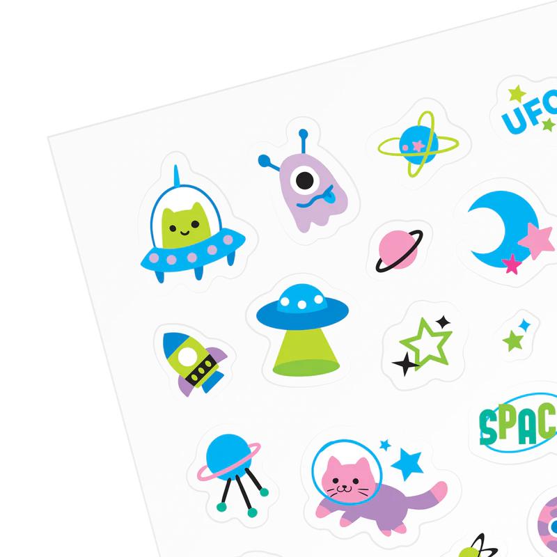 - Stickers feature loveable aliens, friendly planets, and other extraterrestrial friends