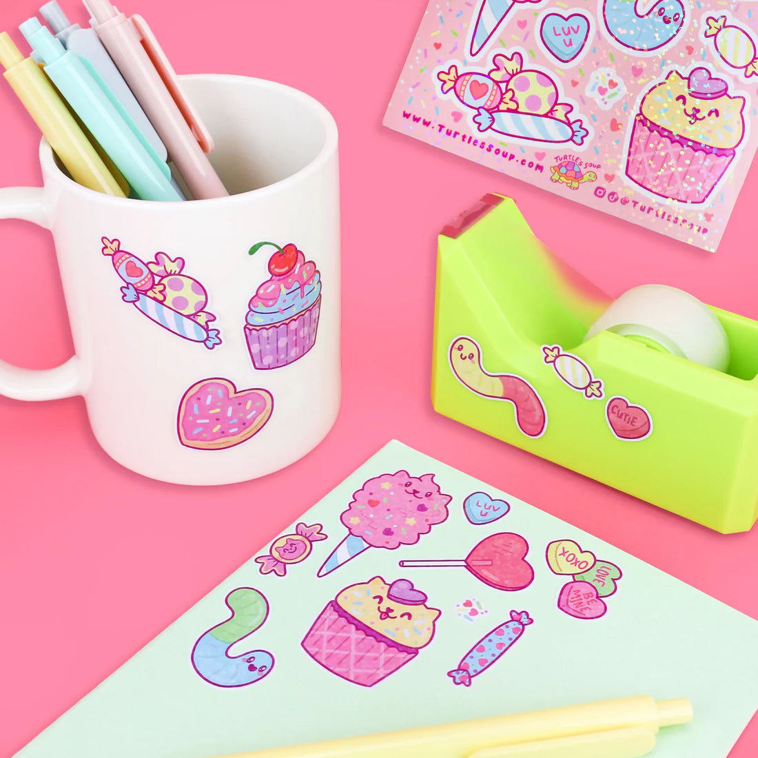 Stickers have never looked so tasty before! From candy to cupcakes and cotton candy, we've included all your favorite sweet treats in this sticker sheet. Show these off to make everyone around you hungry!