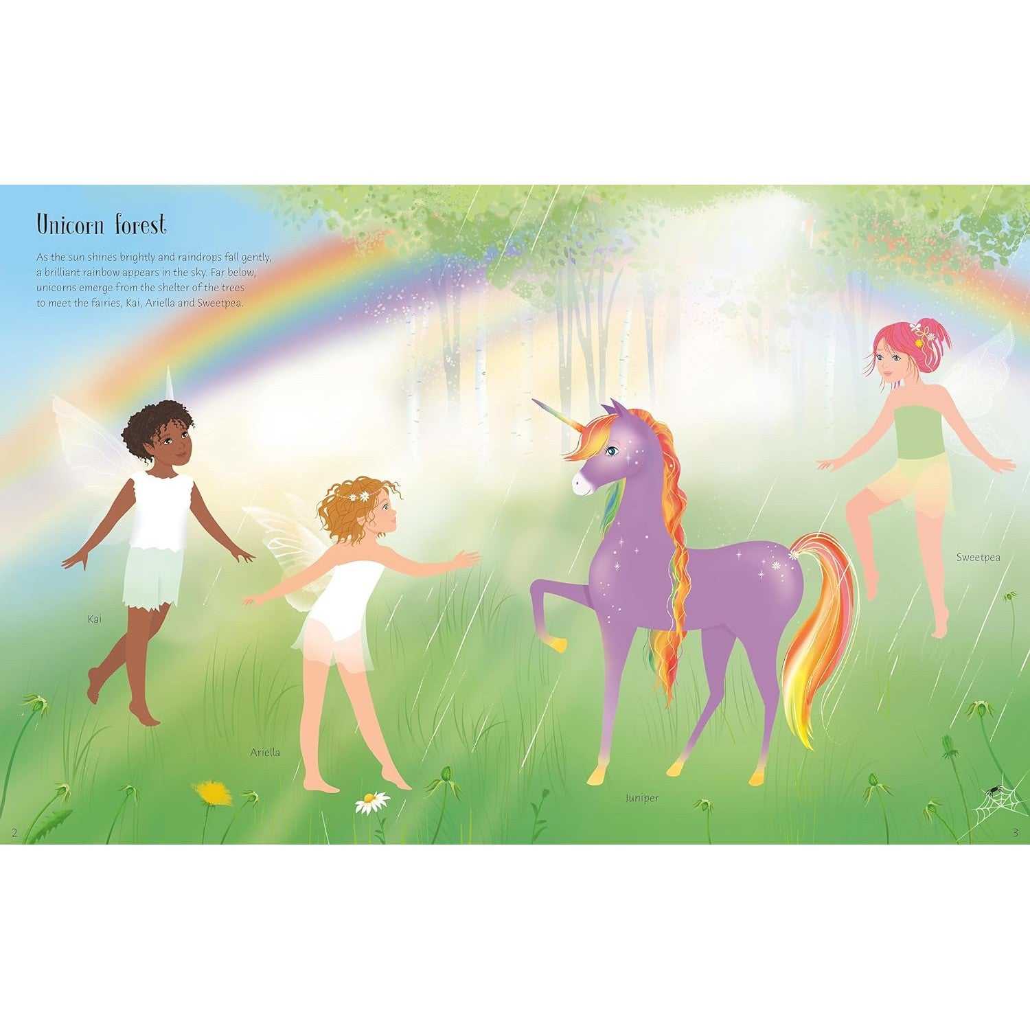 Enter a magical world where unicorns with rainbow manes gallop across the sky, meet a woodland fairy princess, gaze at the Northern lights and rest in a crystal cave. Use the stickers to adorn the unicorns with headdresses and garlands, and choose outfits for the fairy dolls.