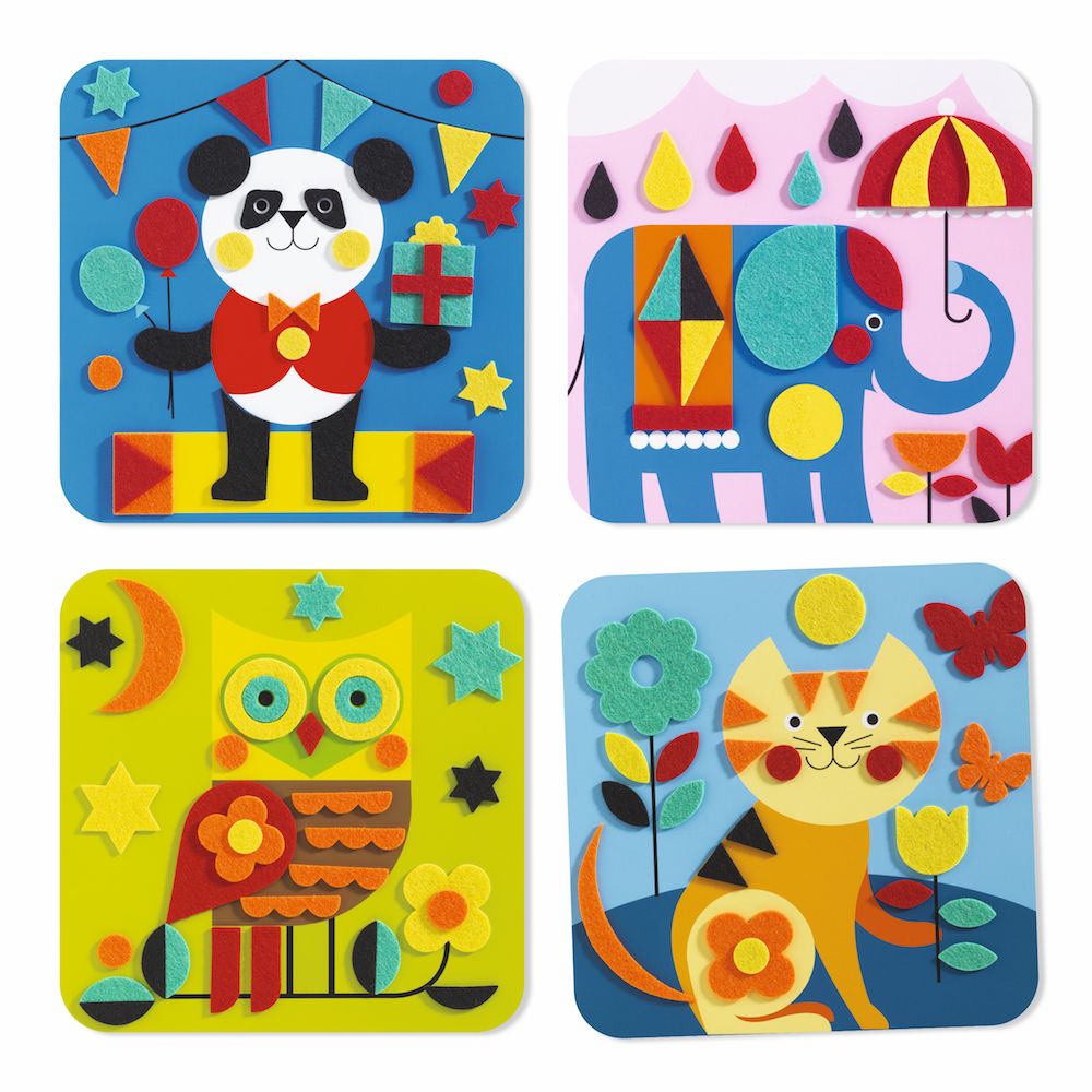 Create beautiful felt collage pictures with the Gentle Creatures felt kit from Djeco. This set comes with 4 picture pages illustrated with a simple animal design and 121 felt stickers to be arranged and placed. Great for dexterity and creativity, kiddos can create their own cute and cuddly soft animal pictures.