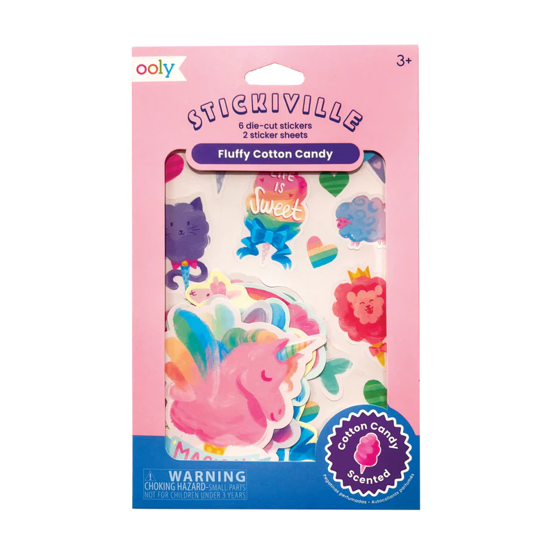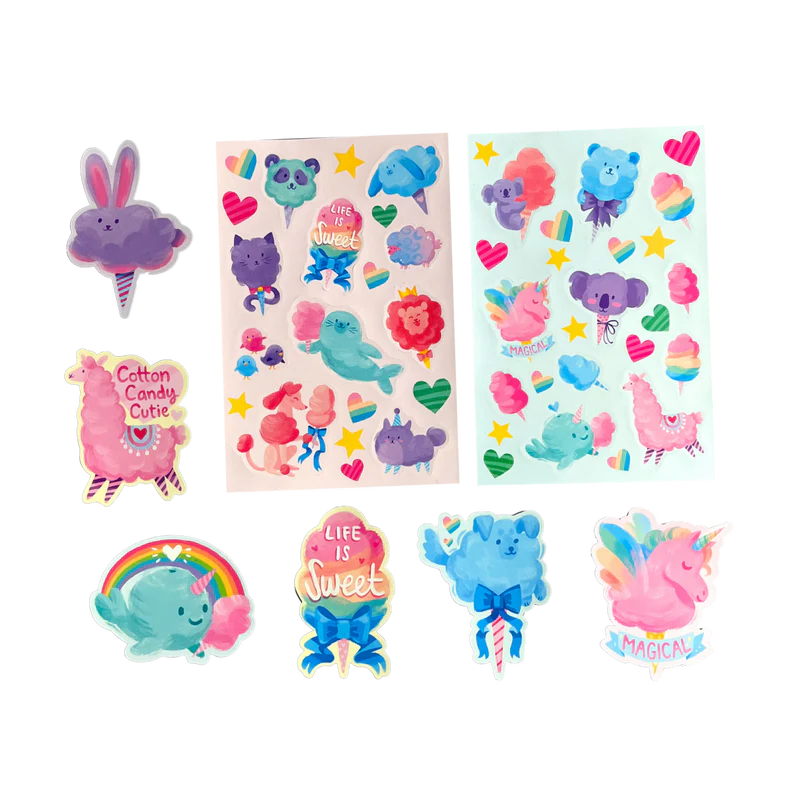 In this sweetly scented world of cotton candy stickers, your favorite spun sugar comes with your favorite fantastical creatures! Narwhals, llamas, bunnies, magical unicorns, and more. Two paper sticker sheets plus six die cuts make this a cotton candy scented celebration! Put them on your notebook to get that sweet smell of cotton candy while you study. Or place them on your backpack to get a yummy whiff while you wait for the bus. Wherever you stick them, these deliciously darling scented stickers are a sweet sensation to your senses!