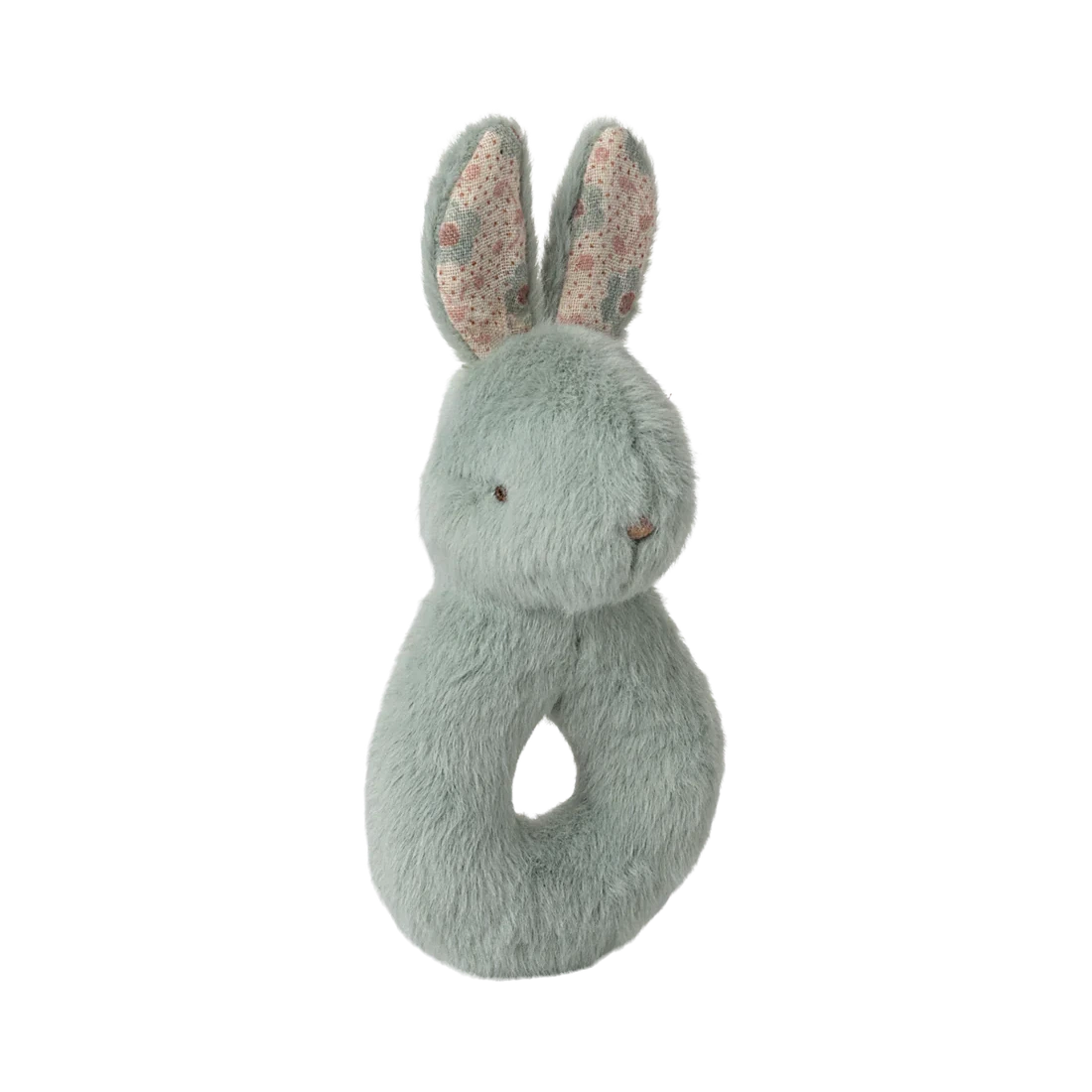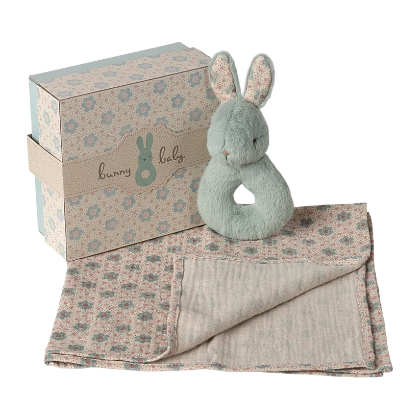A perfect gift idea for the little ones. The set includes a soft cotton cloth and a small rabbit rattle. The rabbit has a small rattle inside that makes a soft sound. It all comes in a beautiful gift box.