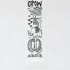 This growth chart features sweet animal faces that smile as your little one grows. Ethically and sustainably made in India using screen printing on organic cotton canvas, finished with a leather hanging cord and stylish fringe end. Comes in a special keepsake bag with a place for your child’s name and birth date. Measures 44×13 inches.