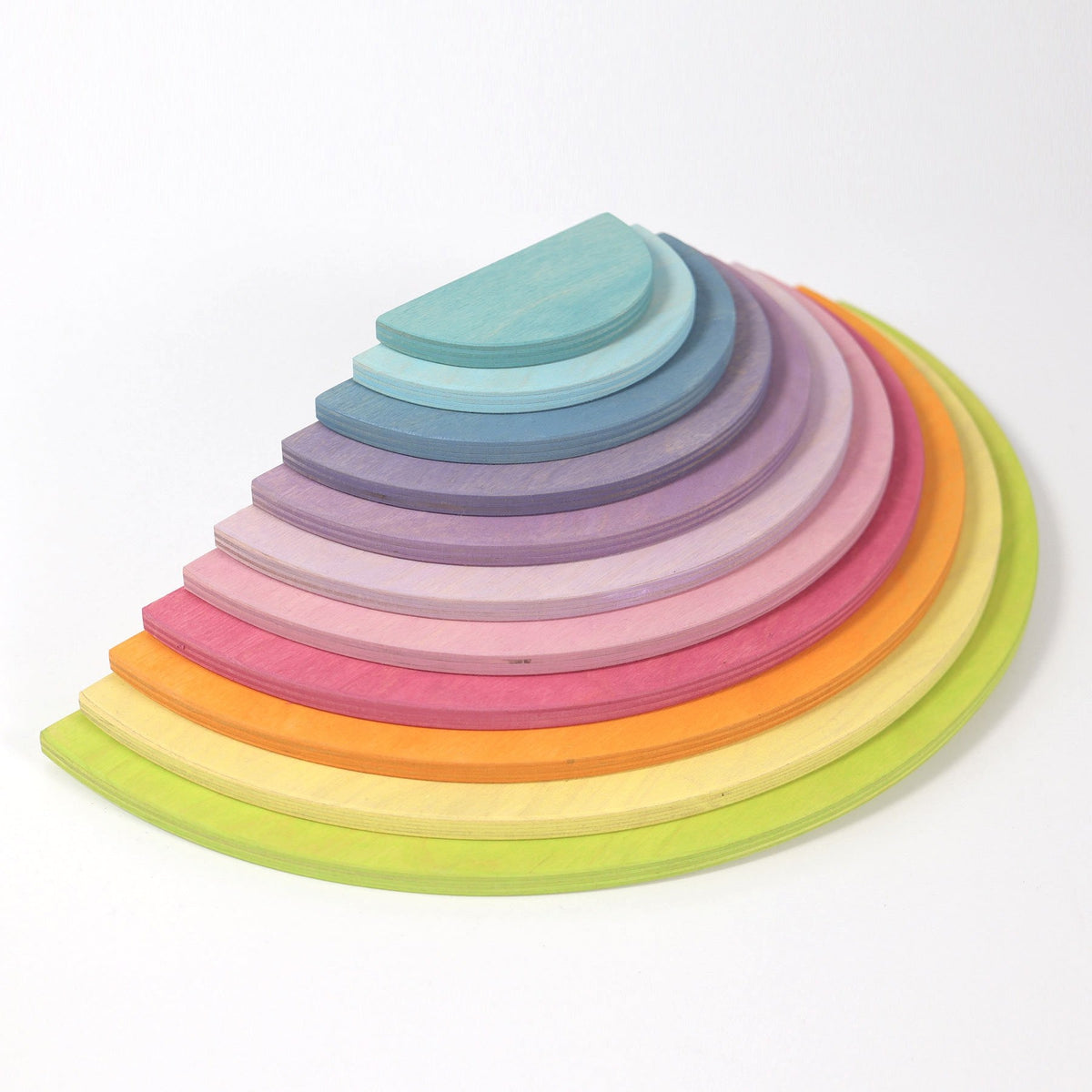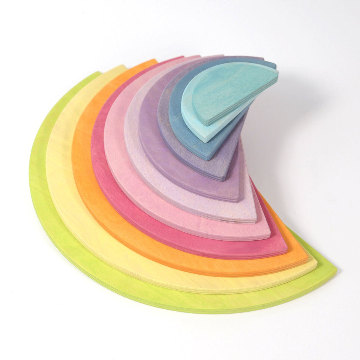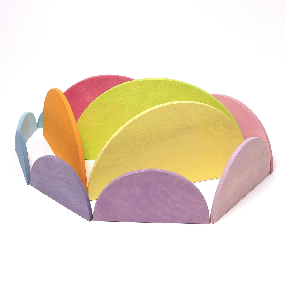 This set of pastel coloured semi-circles will bring your stacking rainbows (sold separately) to whole new levels! Your little architects can create buildings and towers, cakes, amphitheatres, dollhouses and more. Use the semi-circles on their own to learn shapes and colours and to make patterns and pictures.