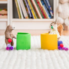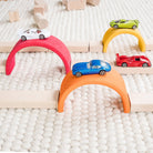 Bring some colour to everyday with this vibrant stacking rainbow! Extend pieces to create a tunnel for your cars and trucks, then build to great heights for mountains, cluster together for little fairy homes, or lengthen into roads and bridges. Turn pieces on their side to weave marble tracks and then neatly stack back in order to sit full spectrum on the shelf.