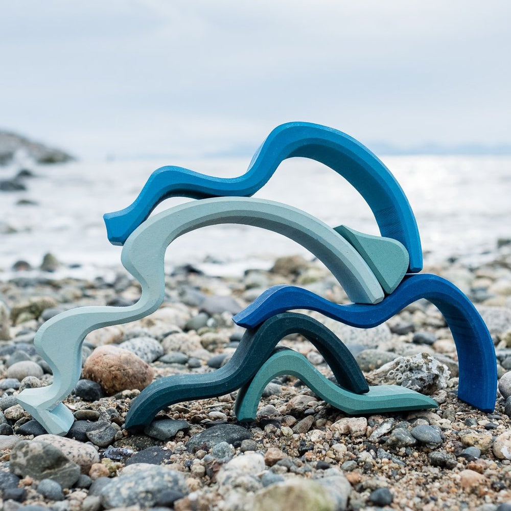 Fluid lines and vibrant blues make it easy to "play in the water" — even in the middle of the living room. The perfect addition to the menagerie of sea life or your swashbucklers and their pirate ship, or playful mermaids and sea nymphs. Great for acting out ocean-themed stories and adventures. This toy gives years of imaginative play and looks great sitting on a shelf too! Pair with the stacking rainbow (air), cave (earth), and fire for all the elements!