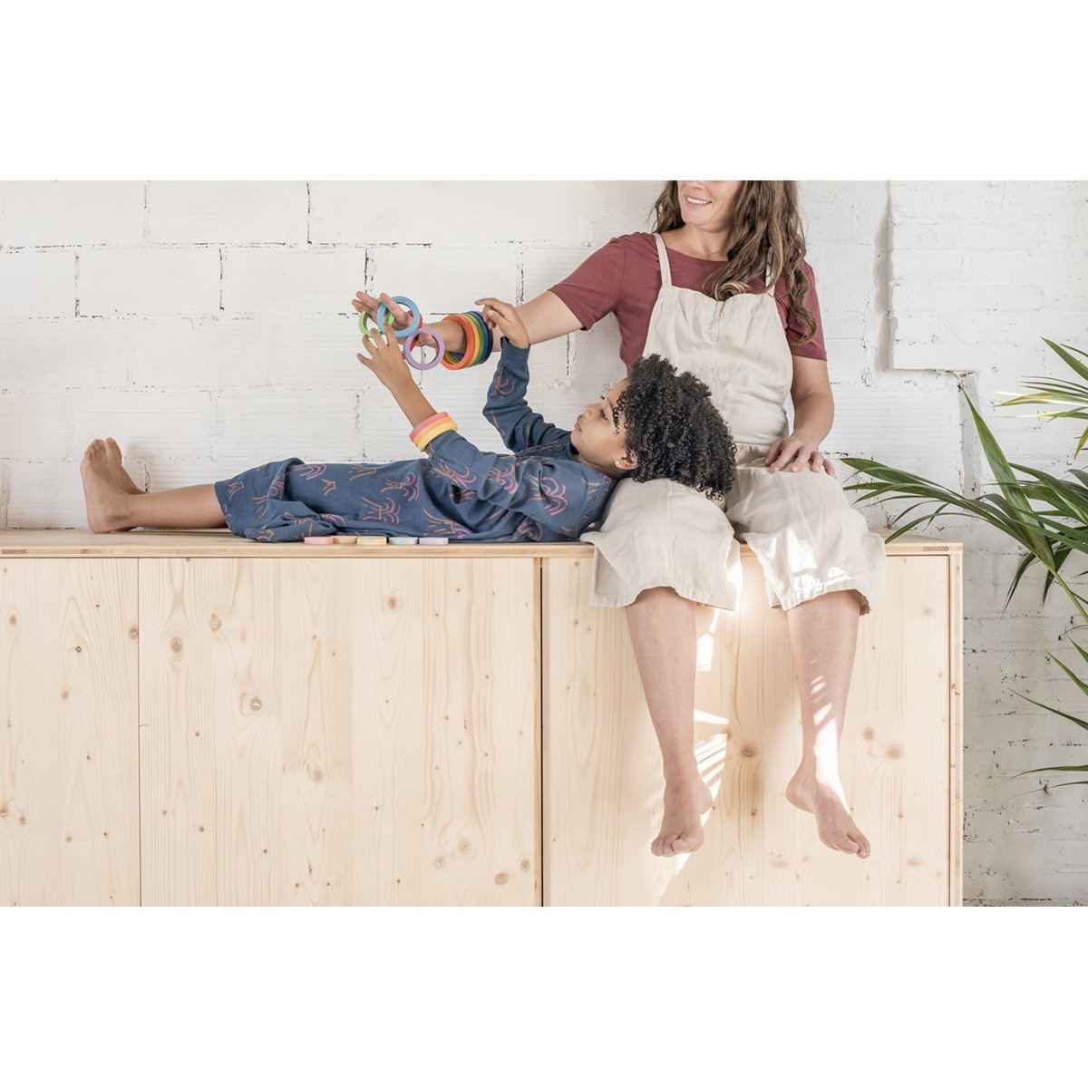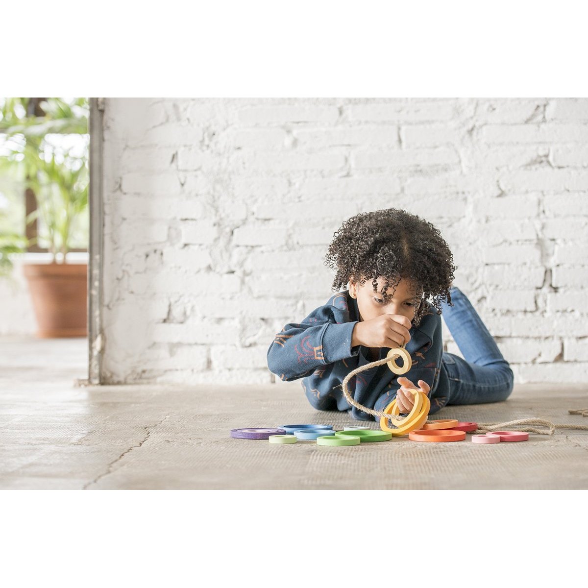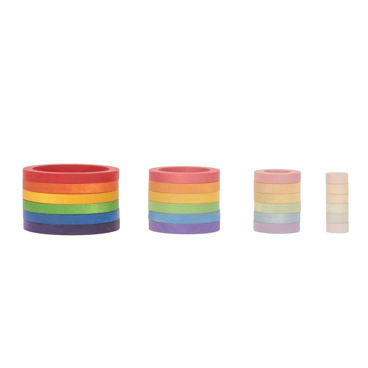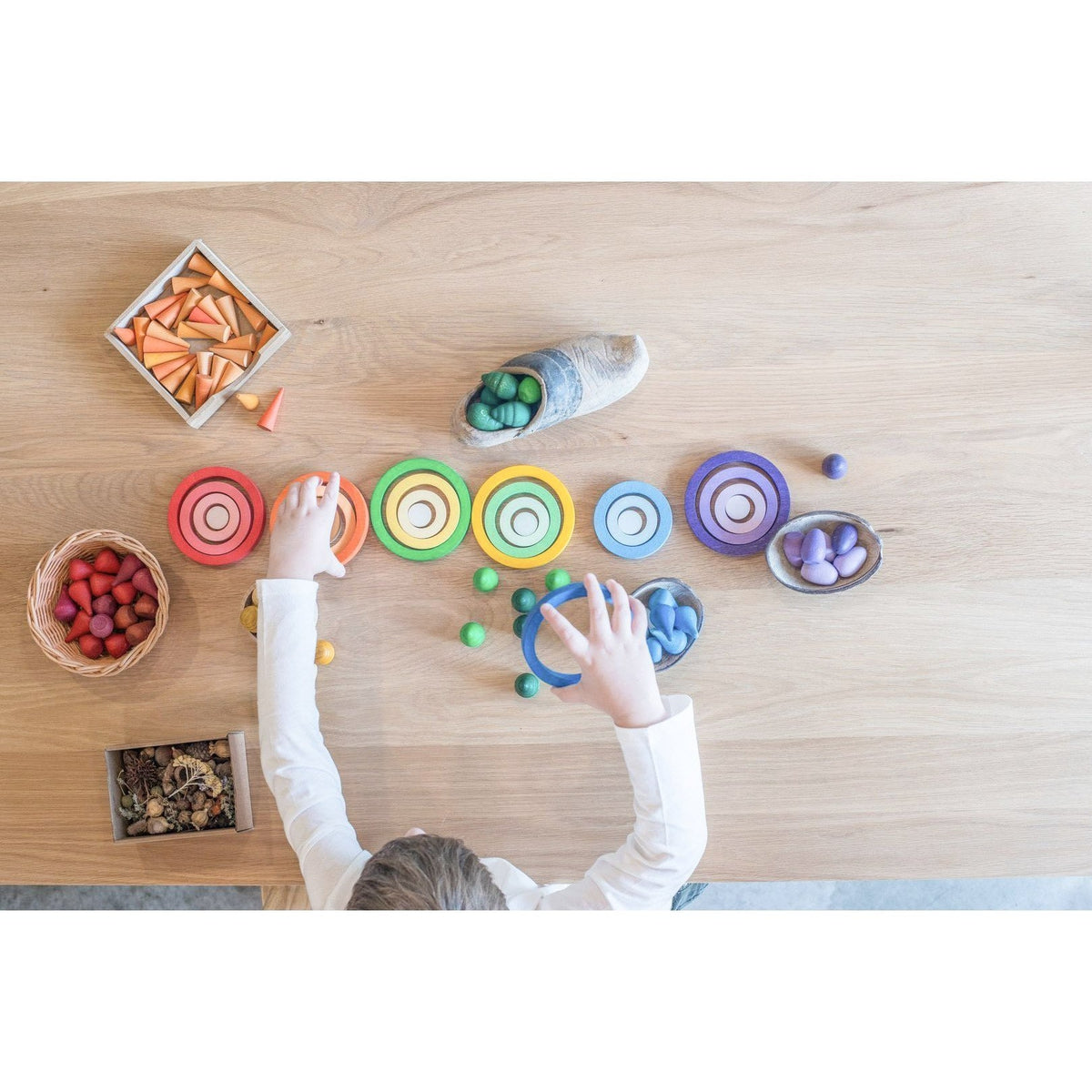 These wooden rings from Grapat are a rainbow lover's dream. Each set of rings comes in a different colour of the rainbow and contains smaller rings in lighter and lighter hues. The rings can be used to stack and balance or threaded on string. You can hide objects and figures with them, create games, or use for counting, sorting, mathematical thinking, and more! Plus we think they are just really beautiful and fun to play with.