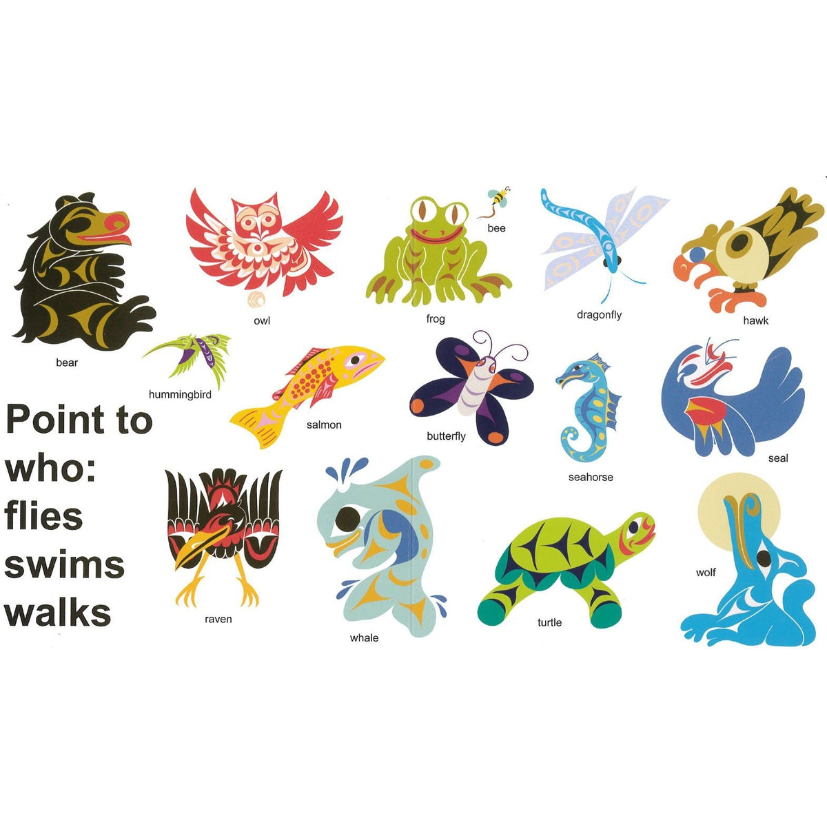 This book offers young children a chance to explore counting, shapes, ABCs, and colours in a setting of Coast Salish, Haida, and Bella Bella art of the Northwest Coast. Nine artists shared their art and culture to create the board book's designs. The book includes a simple maze, a matching activity, and an environmental activity identifying animals and birds of the Northwest Coast.