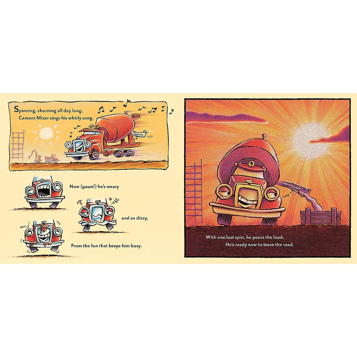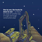 One by one, Crane Truck, Cement Mixer, Dump Truck, Bulldozer, and Excavator finish their work and lie down to rest—so they'll be ready for another day of rough and tough construction play!