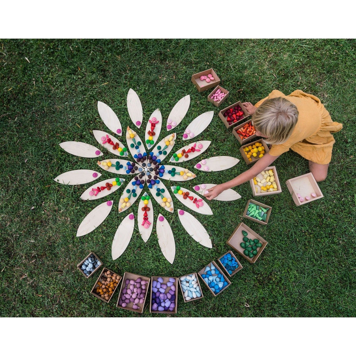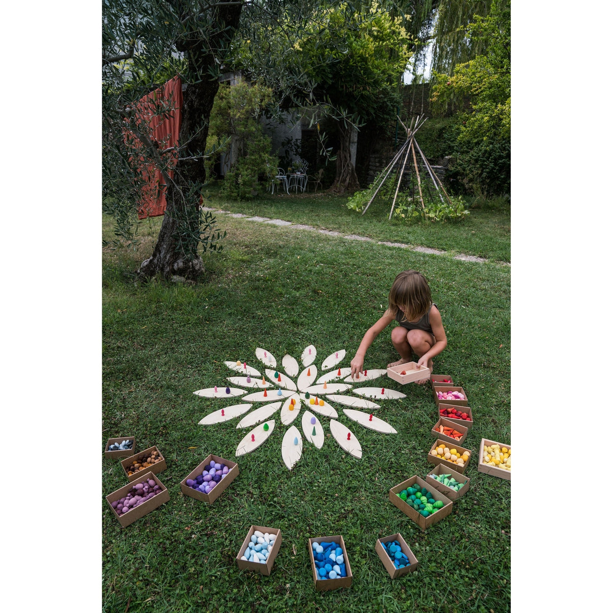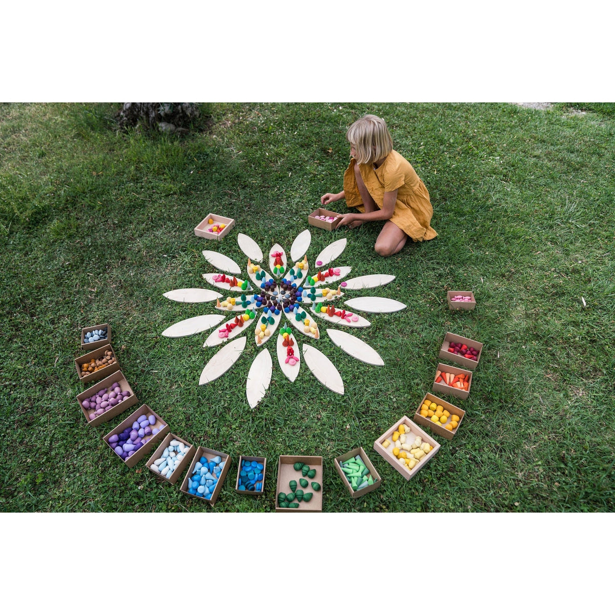 The Petal Platforms from Grapat are identical petal-shaped wooden pieces that provide open-ended play opportunities for your child. Arrange the petals as an extra large mandala, or use the surfaces to sort your smaller Grapat Mandala pieces or Loose Parts pieces. Use the platforms with blocks and figurines to make multi-storied homes or cities. Let your child surprise you with all the creative ways the petal platforms can be played with!