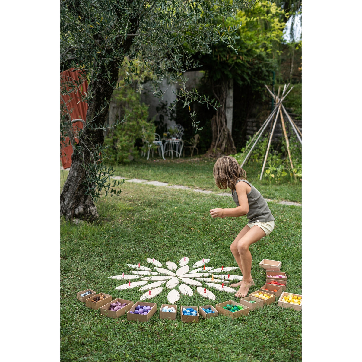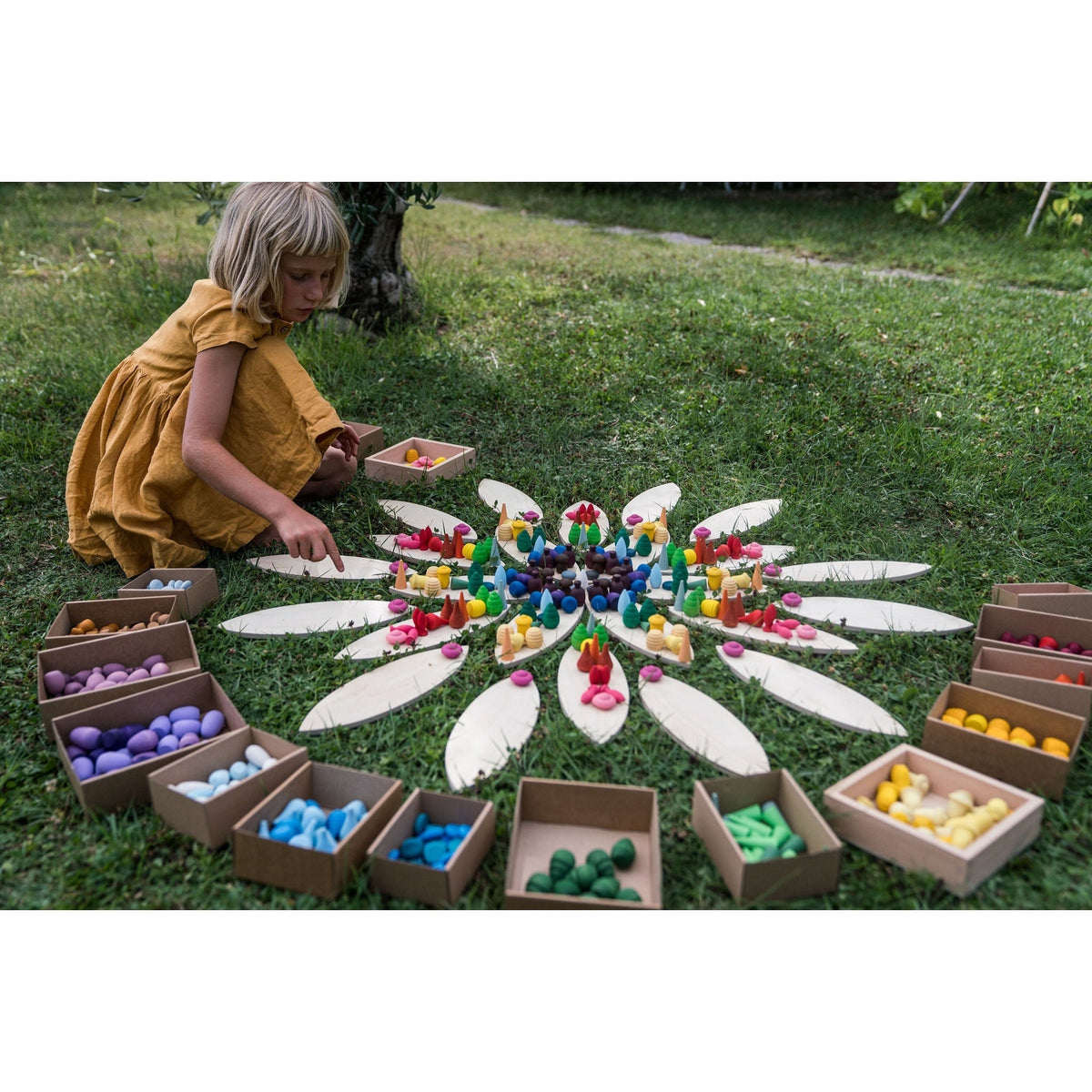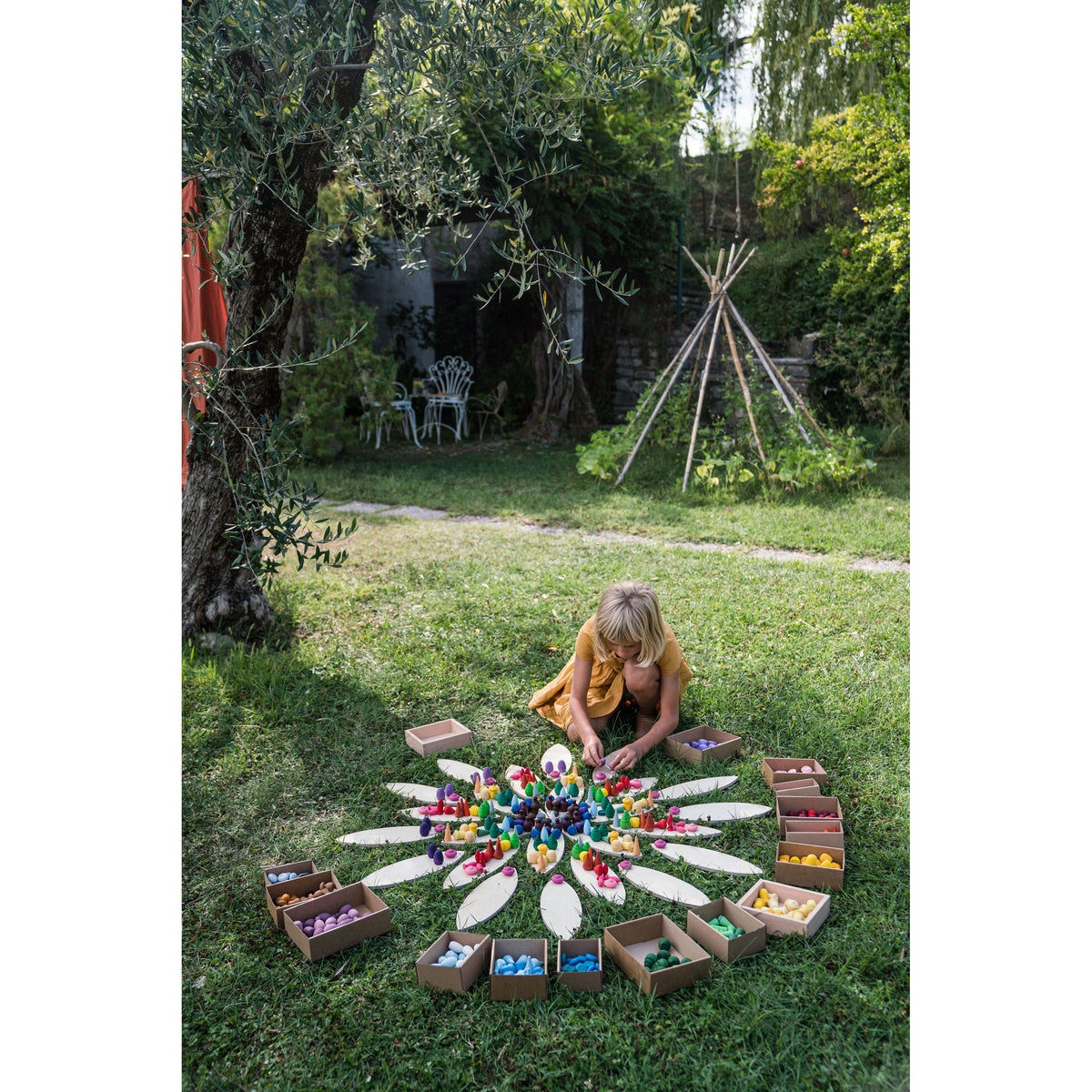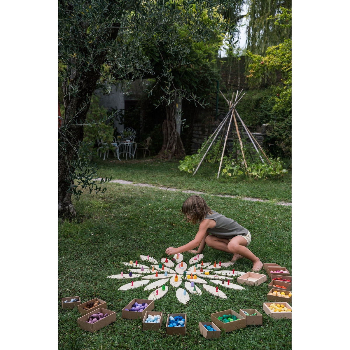 The Petal Platforms from Grapat are identical petal-shaped wooden pieces that provide open-ended play opportunities for your child. Arrange the petals as an extra large mandala, or use the surfaces to sort your smaller Grapat Mandala pieces or Loose Parts pieces. Use the platforms with blocks and figurines to make multi-storied homes or cities. Let your child surprise you with all the creative ways the petal platforms can be played with!