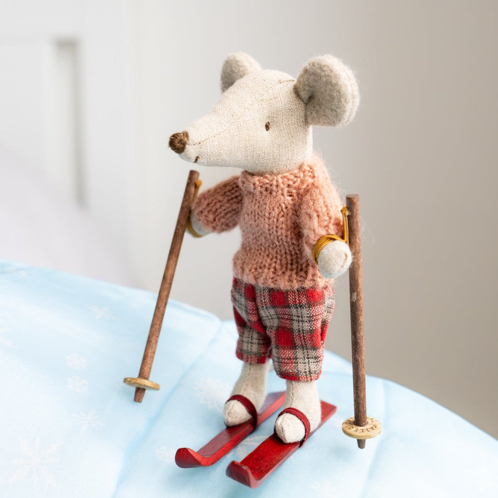 A mouse ready for hours of fun on the slopes during the cold wintertime. Each playset contains a warmly dressed mouse with a pair of ski and poles. A funny detail is the ears which are made so they look like the mouse is wearing ear warmers.