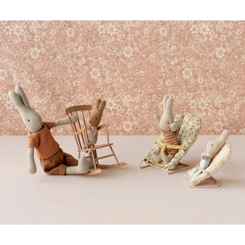 With this baby sitter, it is easy to put your little friends to sleep. The base is made of metal and covered by the most lovely fabric. The chair fits micro sized rabbits and bunnies and Teddy Baby perfectly.