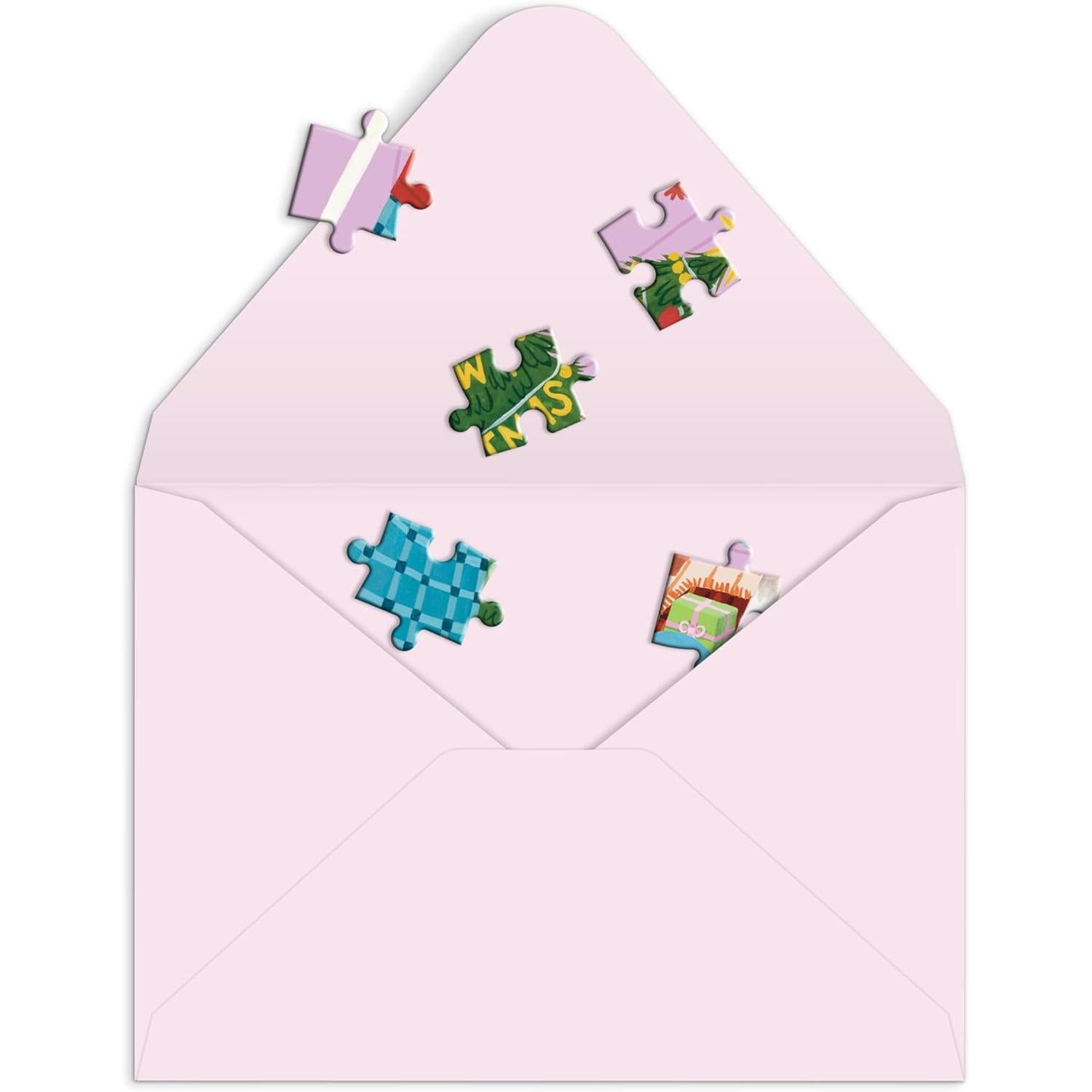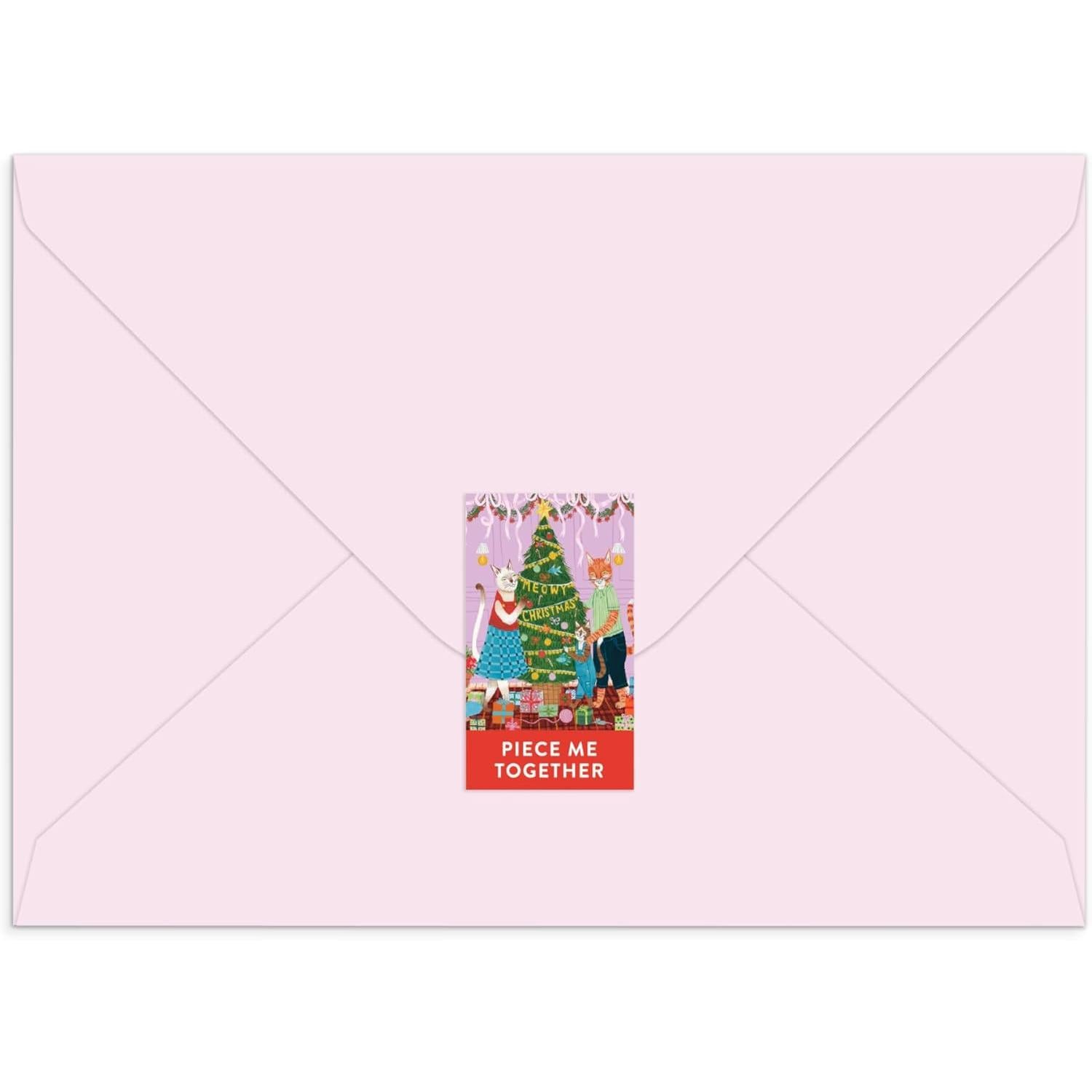The greeting card design captures the charm of the holidays in a cozy kitty living room, decorated for Christmas. After writing a personal message on the back, one can then break up the puzzle and send the pieces to a friend, colleague or loved one to puzzle together and read.