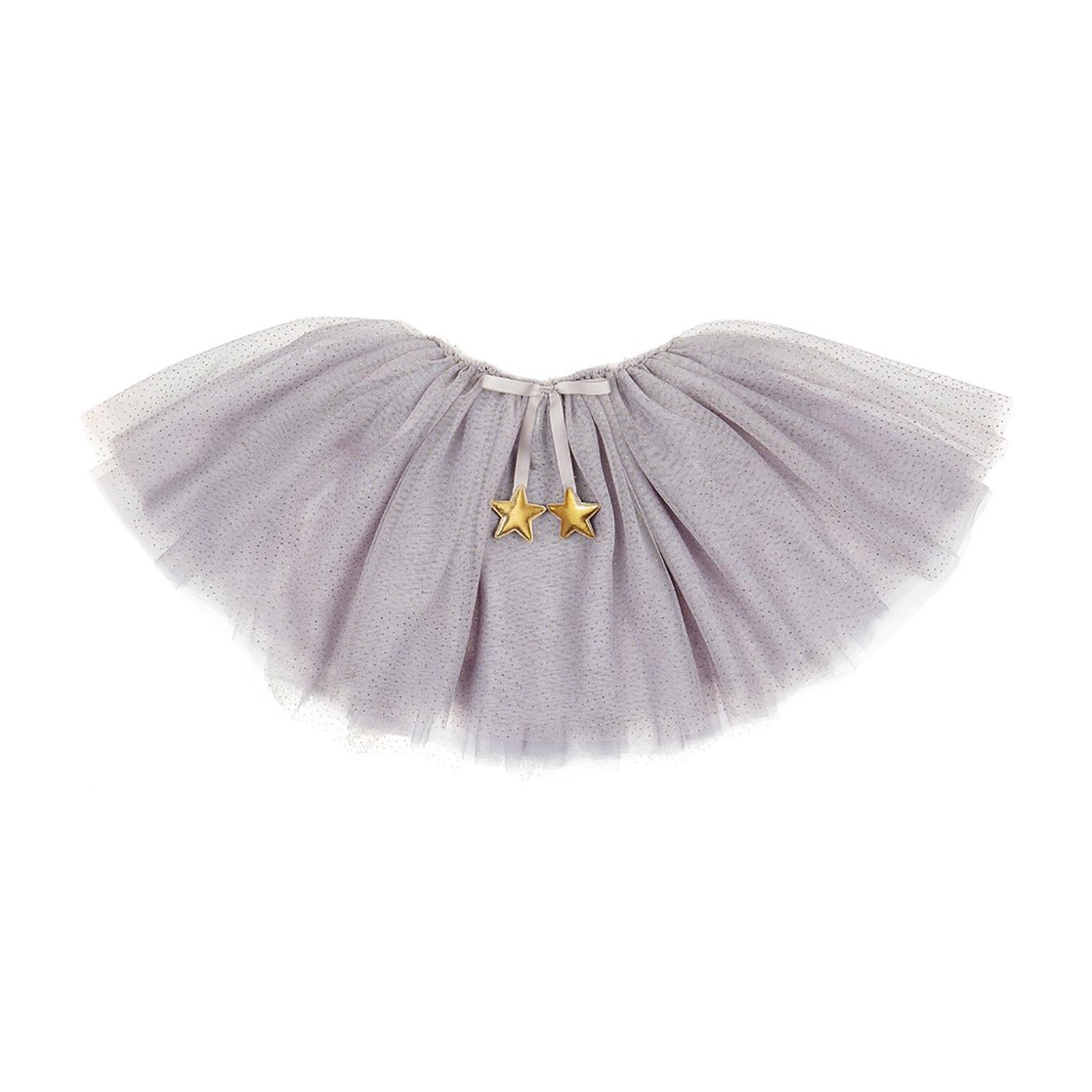 Our gorgeous fairy dust tutu comes in the loveliest shade of pale grey. With silver glitter dots and 6 layers of fabric and finished with a pair of gold stars, this tutu has an elasticated waistband to fit all ages from 3-10. From parties, to play, to everyday, this tutu can be worn in lots of different ways. Go full fairy by matching with wings and a wand or dress down with a T-shirt and pair of glittery glasses!