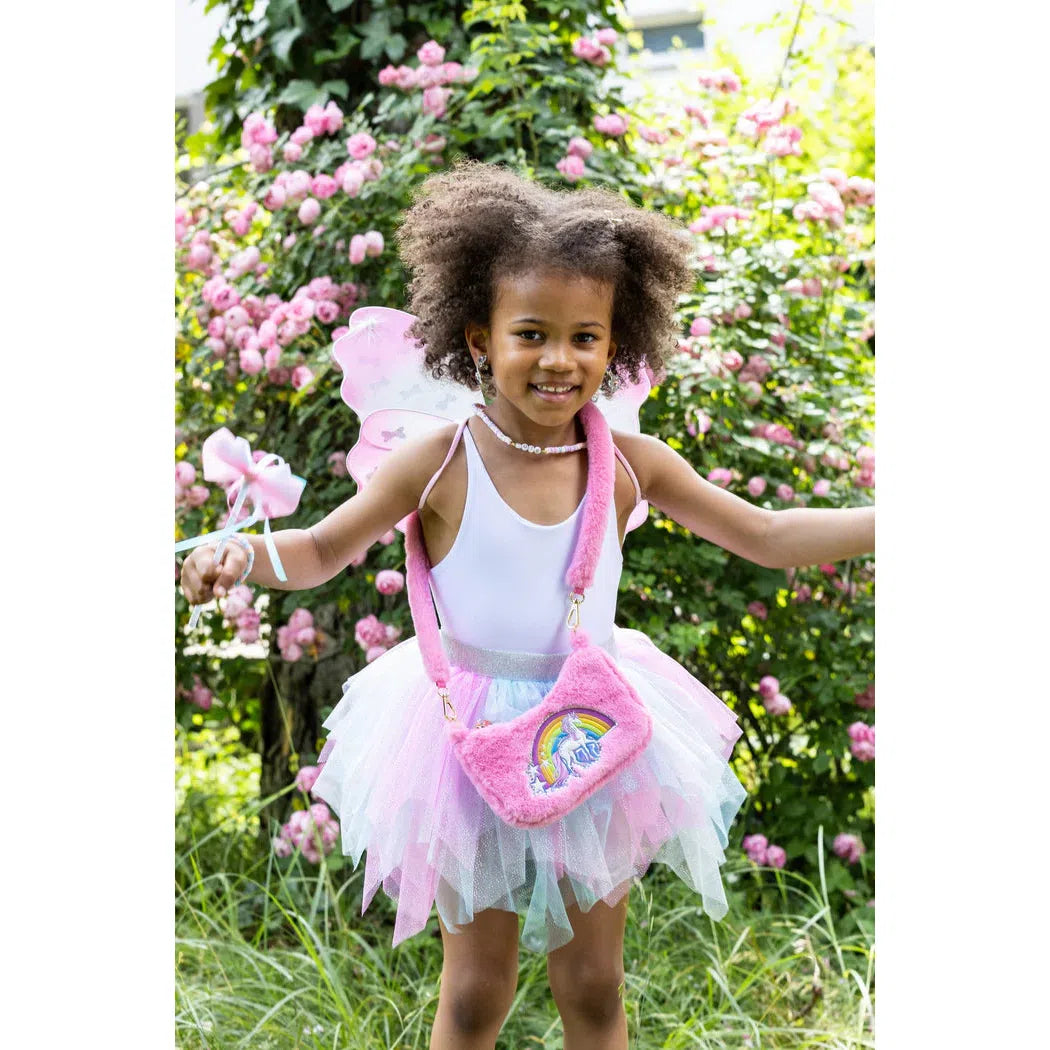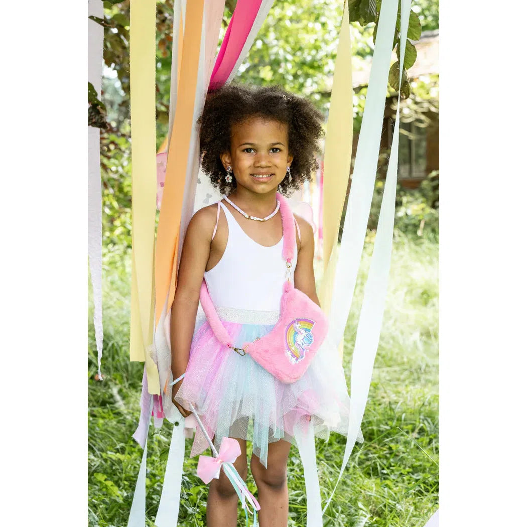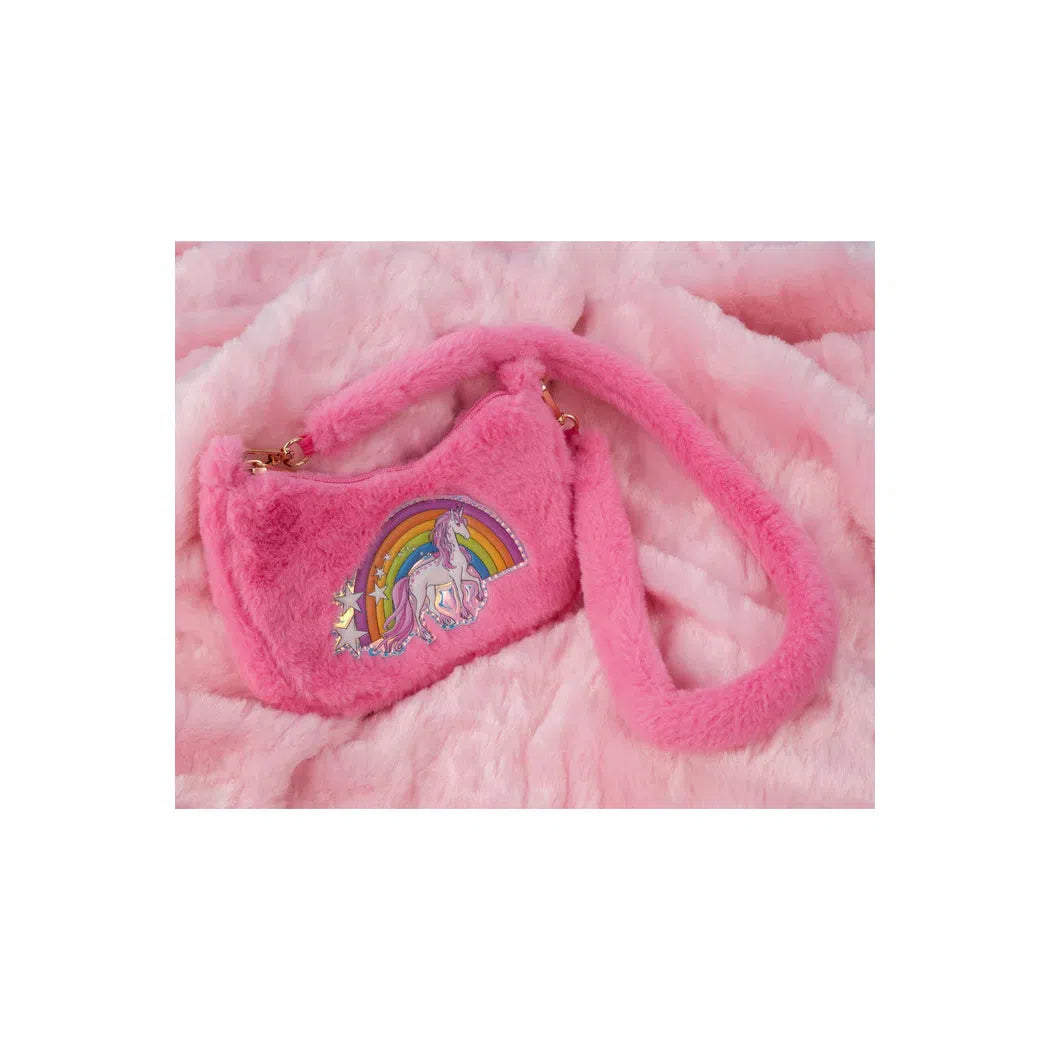 Let your little one carry a world of magic with the Pink Rainbow Crossbody Purse! This furry, soft-touch purse features a charming pink unicorn at the center, surrounded by a dazzling rainbow backdrop sprinkled with twinkling stars.