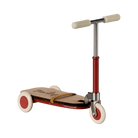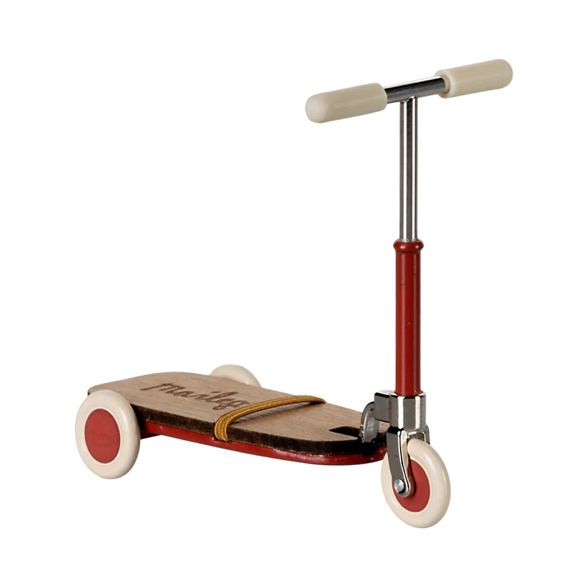 A kickboard with wooden details. The kickboard has a metal stick in the handlebars that makes sure mice with magnets in hands can stay on the board. A small elastic is added on the board and will secure the feet on the board during the ride.