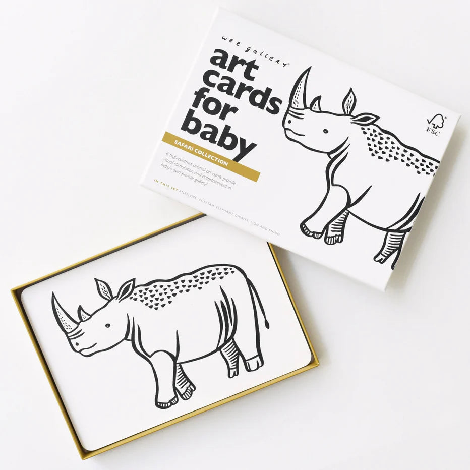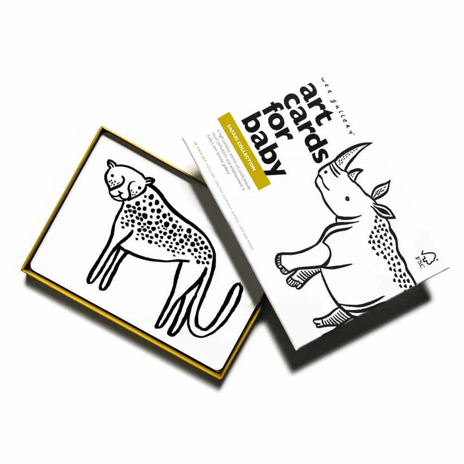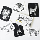 Get ready to go on a safari! Introduce young children to animals early with these whimsically illustrated high contrast black and white art cards.