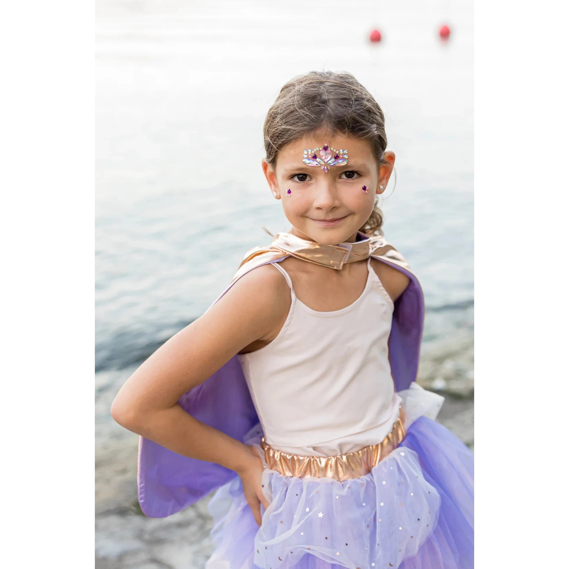The metallic rose gold cape, lined with a beautiful lilac satin, billows with superhero grace, making every move a statement of power and style. The tutu, featuring a metallic rose gold waistband, showcases a celestial display of printed stars and layers of lilac and pink tulle, ensuring twirls and spins are nothing short of magical.
