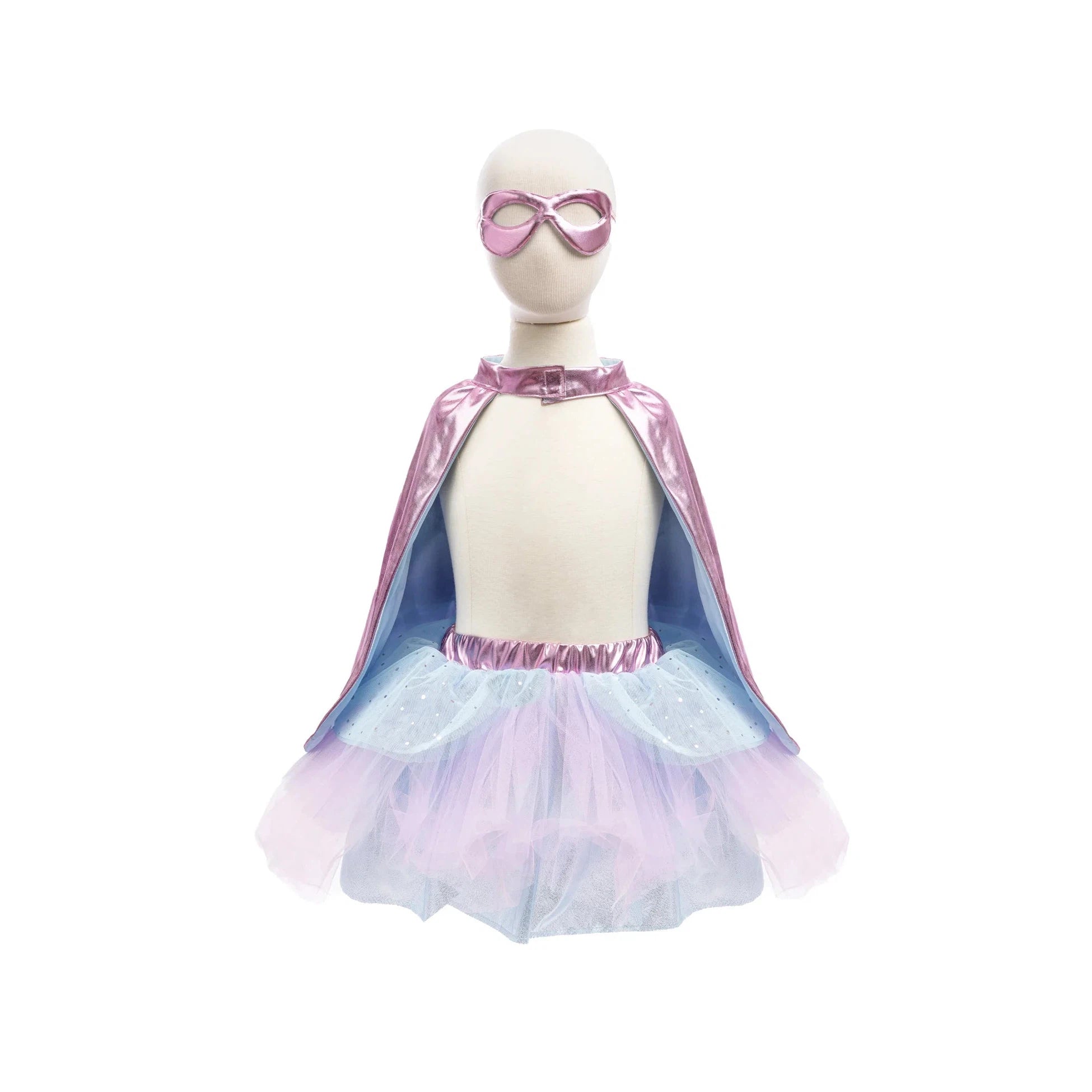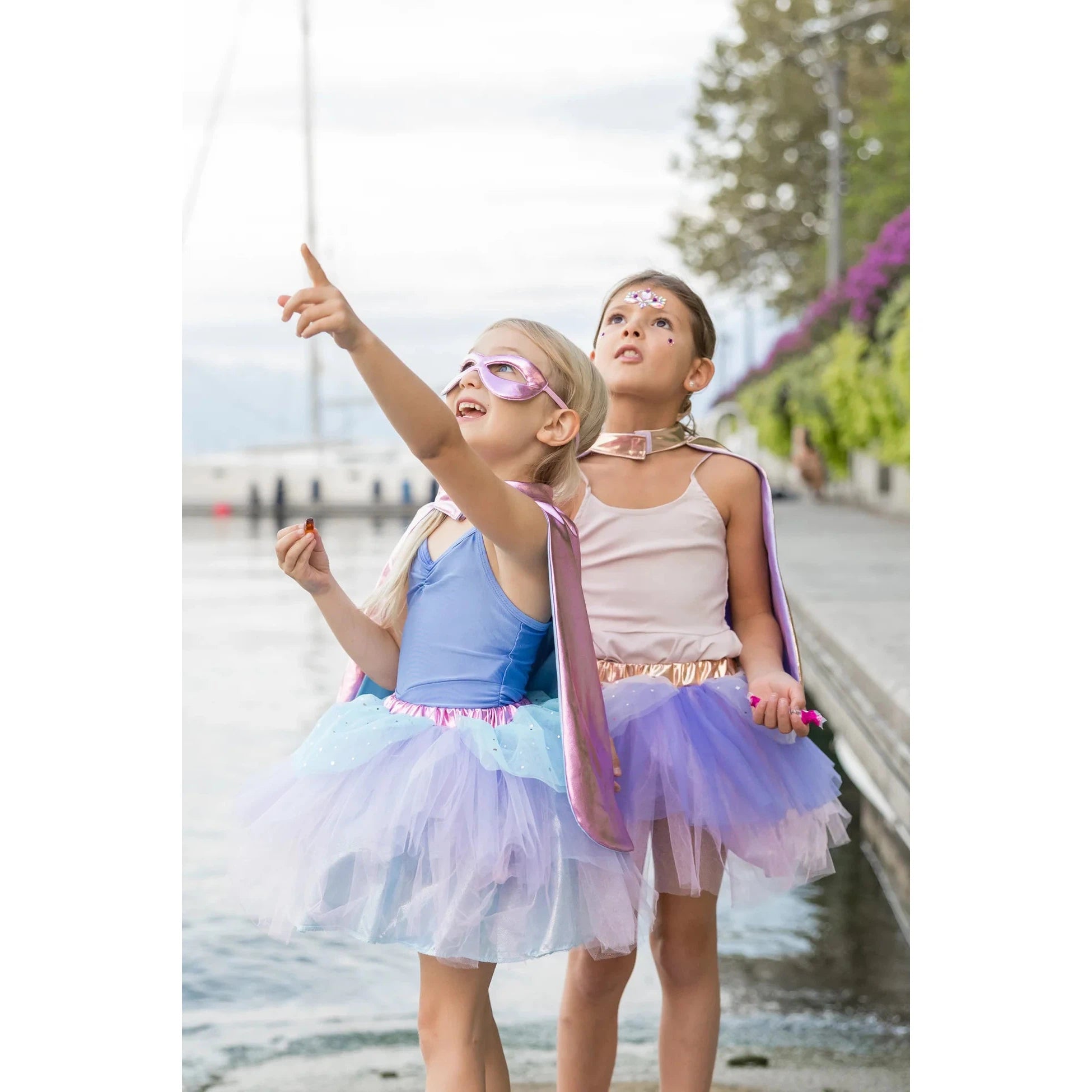Unleash your child's inner superhero with our Super-Duper Tutu, Cape & Mask set in mesmerizing Metallic Pink & Light Blue! This ensemble is a burst of magical colors and imaginative play.