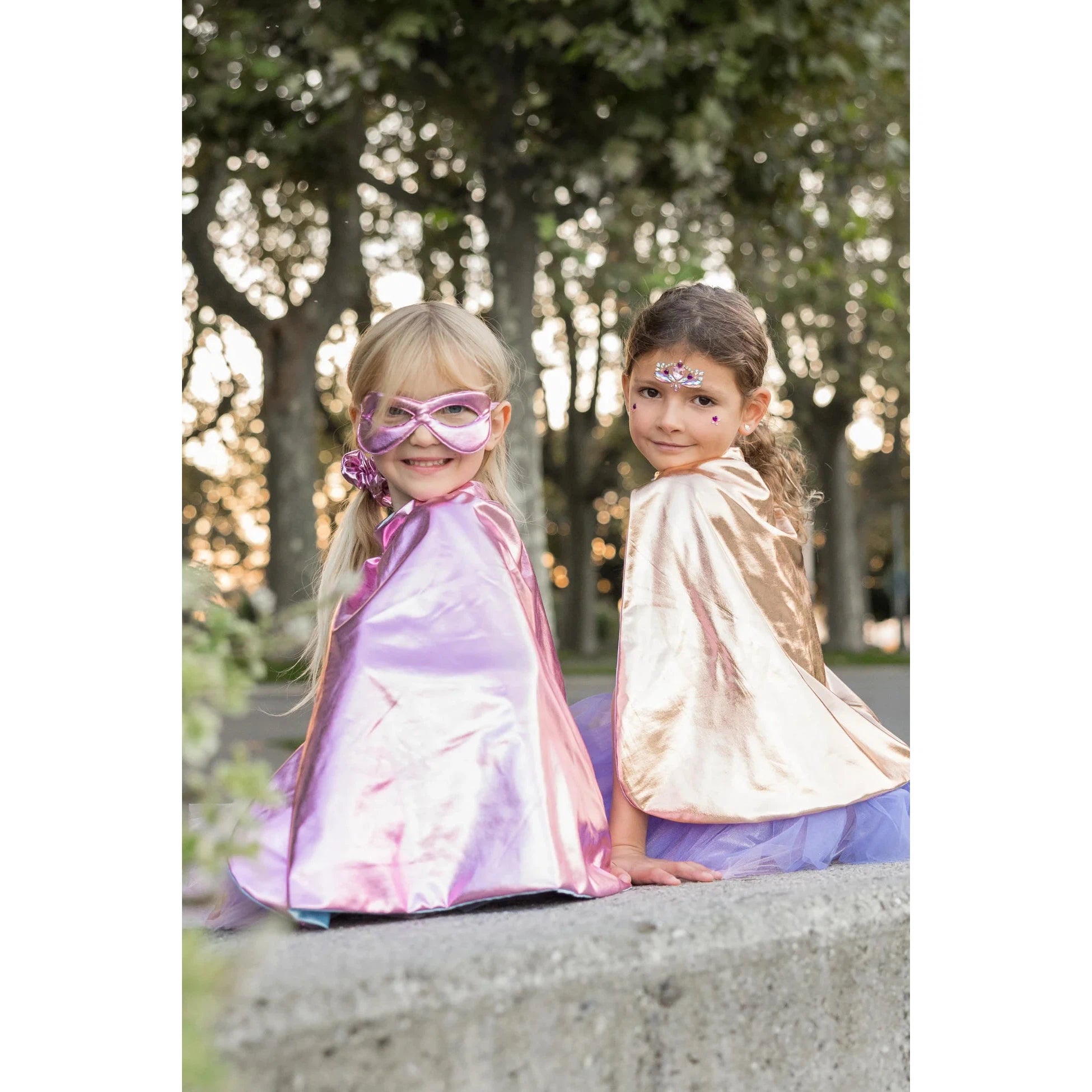 The metallic pink cape, lined with beautiful blue satin, billows with superhero elegance, making every little hero stand out. The matching metallic pink eye mask adds an air of mystery, perfect for concealing their secret identity.
