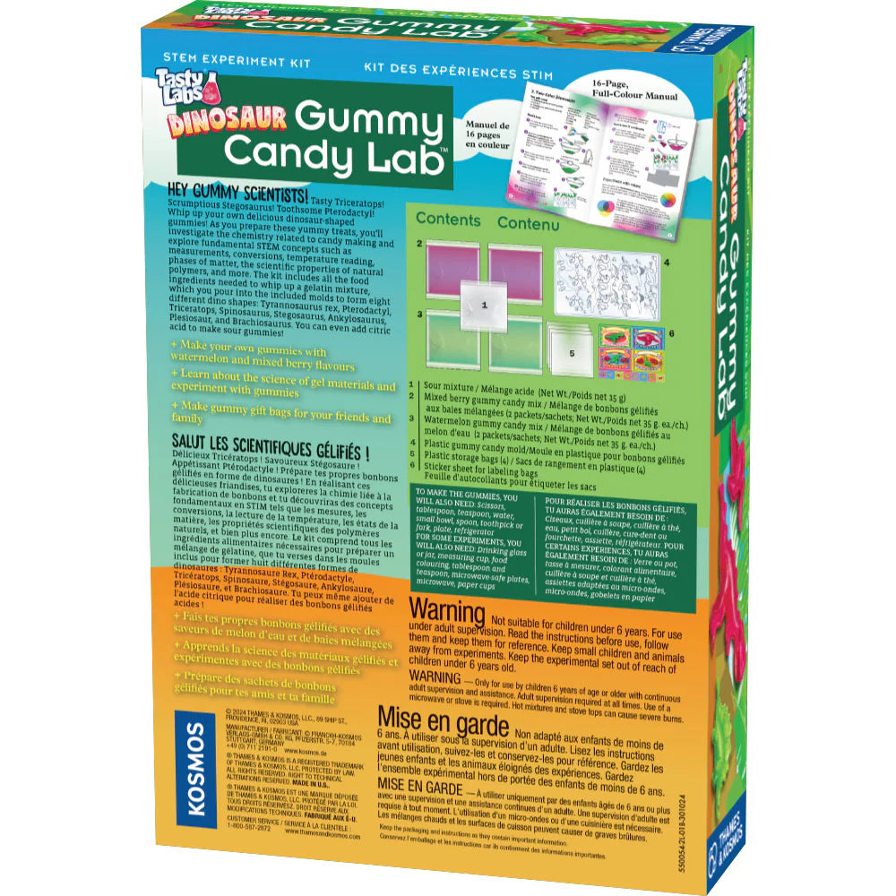 Tasty Triceratops! Scrumptious Stegosaurus! Toothsome Pterodactyl! Whip up your own delicious dinosaur-shaped gummies! As you prepare these yummy treats, you’ll investigate the chemistry related to candy making and explore fundamental STEM concepts such as measurements, conversions, temperature reading, phases of matter, the scientific properties of natural polymers, and more. The kit includes all the food ingredients needed to whip up a gelatin mixture, which you pour into the included mold to form eight different dino shapes: Tyrannosaurus rex, Pterodactyl, Triceratops, Spinosaurus, Stegosaurus, Ankylosaurus, Plesiosaur, and Brachiosaurus. A specially designed recipe and custom tooling help ensure successful results and great-tasting gummies in two yummy flavors: purple mixed berry and green watermelon. You can even add citric acid to make sour gummies! Make up to 72 gummies with the ingredients and tools included!