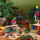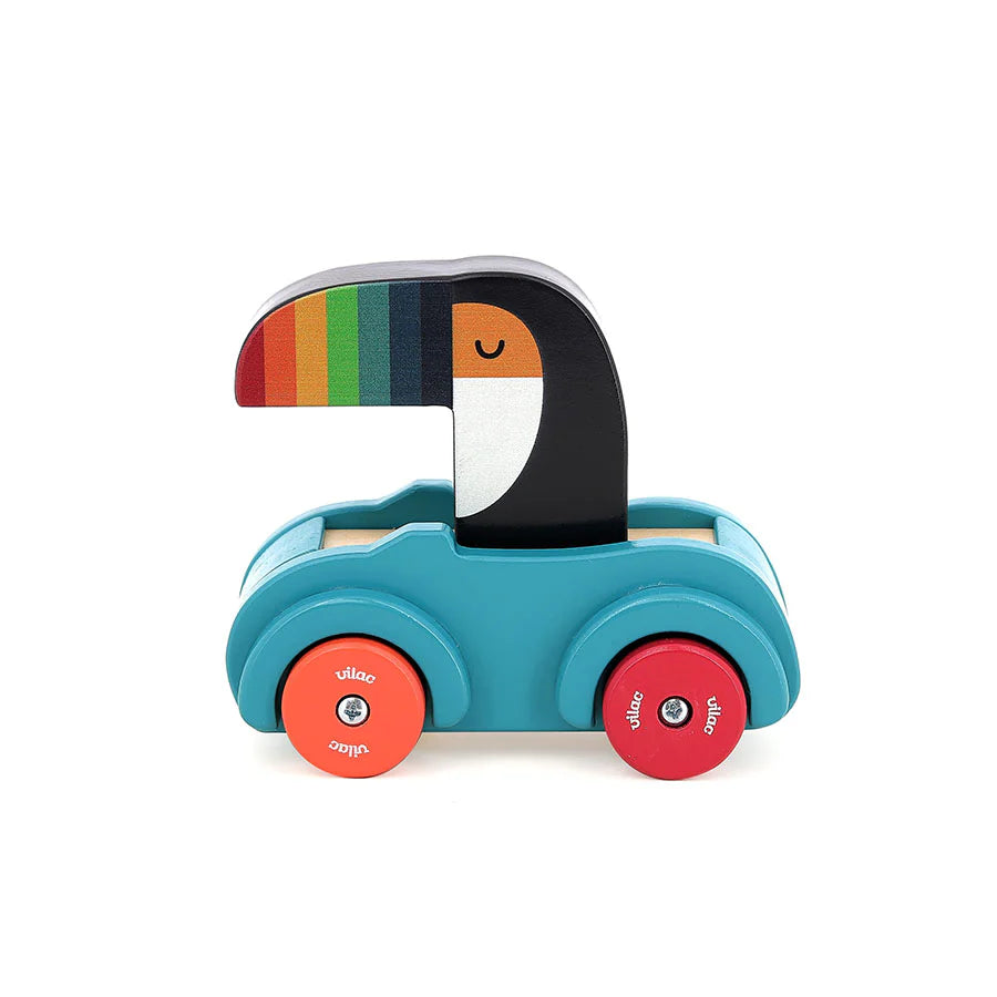 Climb aboard this convertible car, illustrated by Andy Westface. Fall in love with this educational toy that will help your child develop their imagination and fine motor skills. At the wheel of this racing car is a mischievous toucan with a colorful beak. And surprise! When your child presses the toucan's head, it makes a fun "squeak squeak" sound.