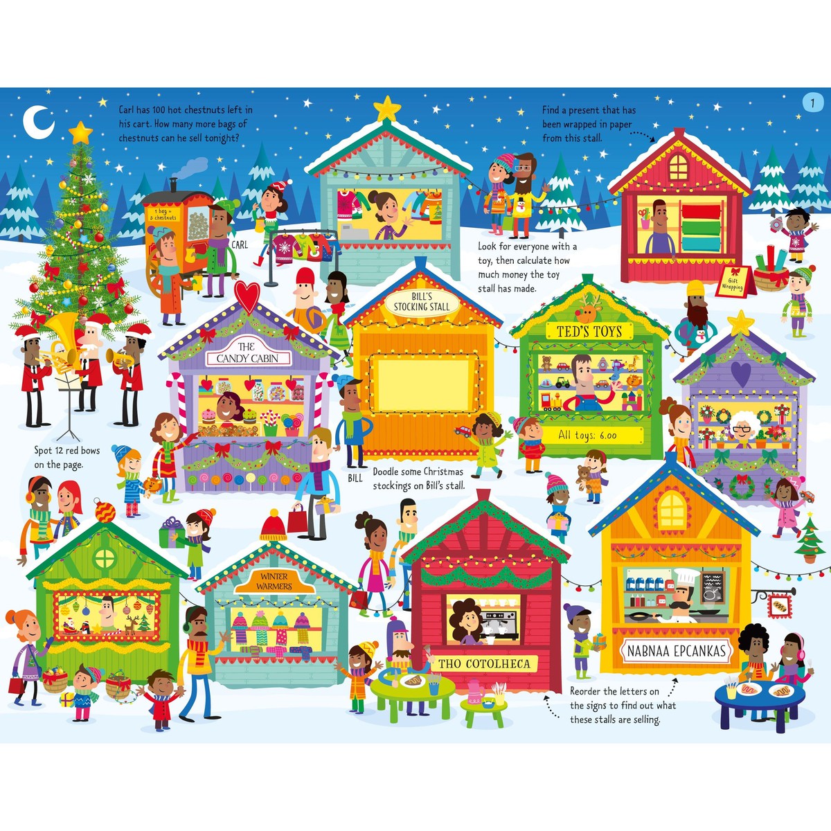 Each big page in this fun-packed book features a jolly Christmas scene, crammed full of things to spot, puzzles to solve and details to doodle and draw, and there are more puzzles and pictures to colour on the back of each sheet.