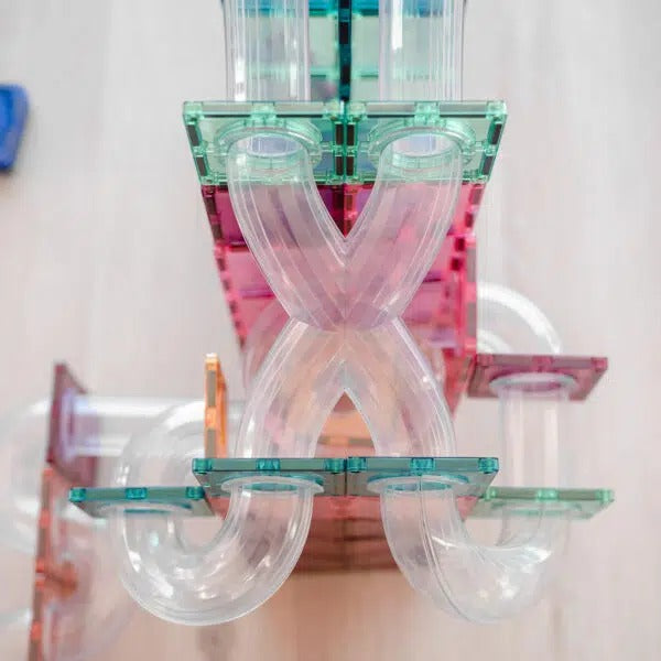 This open-ended expansion pack includes connector square magnetic tiles, wooden balls plus a range of clear, fluted tubes to allow you to explore motion and gravity like never before – an X-shape to re-direct and pivot the action, double-entry bowls for new ways to collaboratively play and race, spiral pieces for eye tracking fun, plus 1/2 and 1/4 pieces for twists and turns.