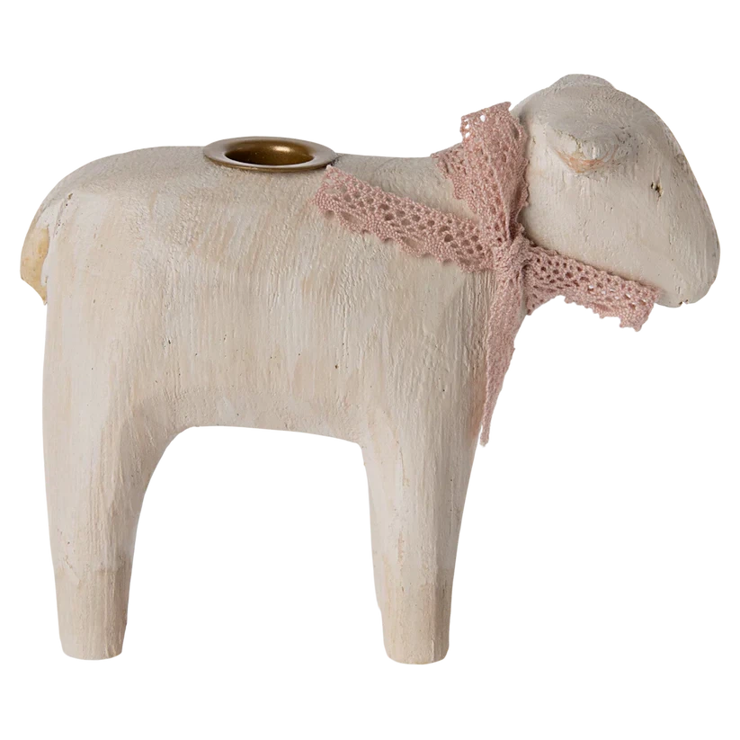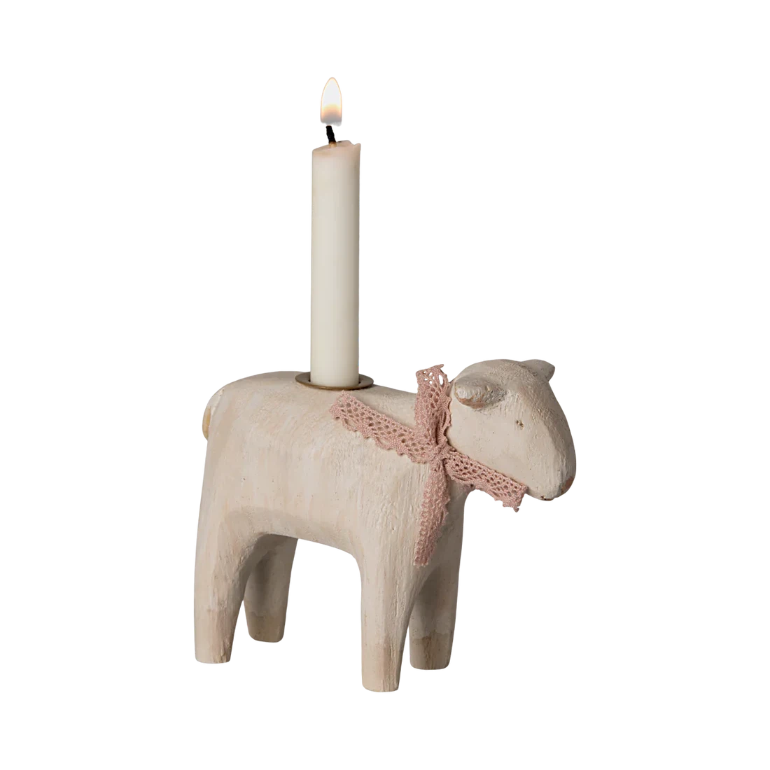 Let this beautiful candleholder decorate your home or on the Easter table. It is handmade which makes each lamb unique and has a soft ribbon around the neck. Never leave candles burning unattended!