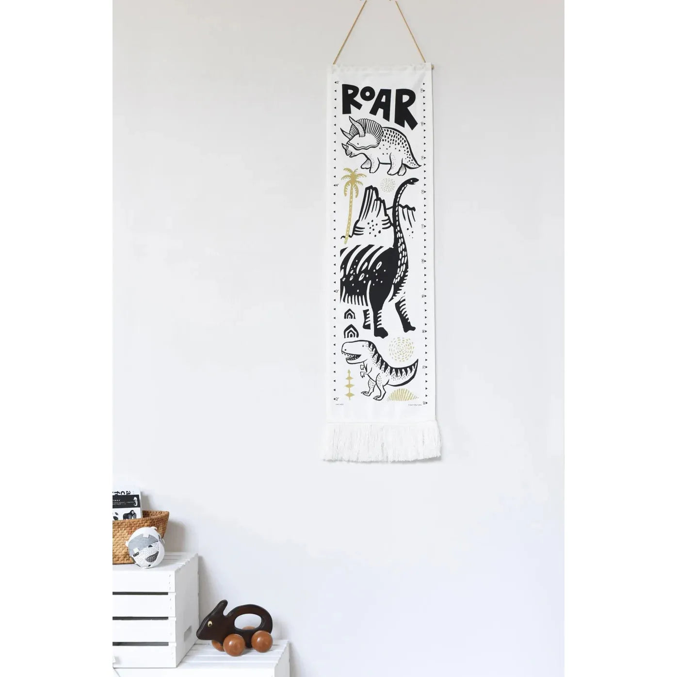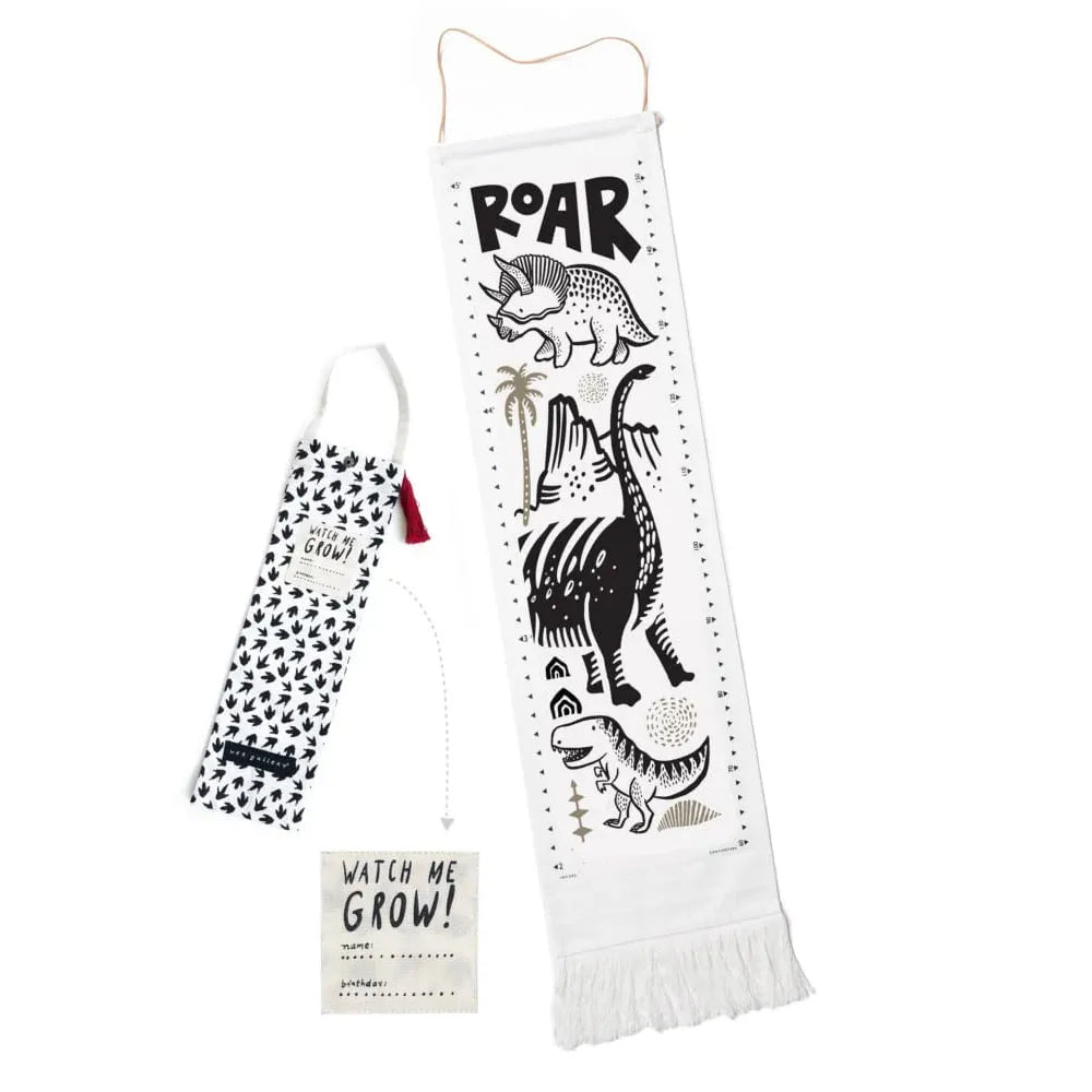 This growth chart features fierce dinosaurs that smile as your little one grows. Ethically and sustainably made in India using screen printing on organic cotton canvas, finished with a leather hanging cord and stylish fringe end. Comes in a special keepsake bag with a place for your child’s name and birth date. Measures 44×13 inches.