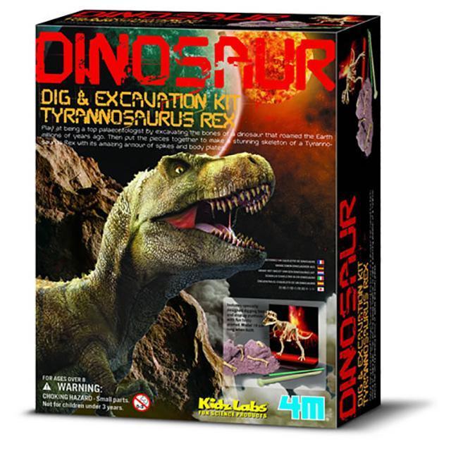 - contains: 1 plaster block with tyrannosaurus skeleton, 1 digging tool, 1 brush, display platform, and instruction and quiz sheet
