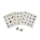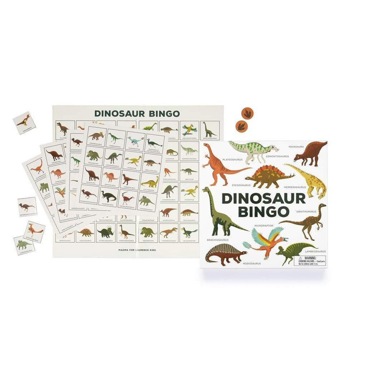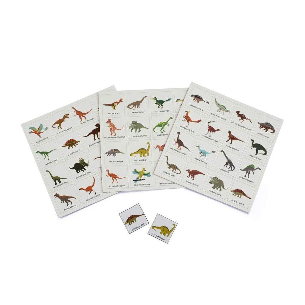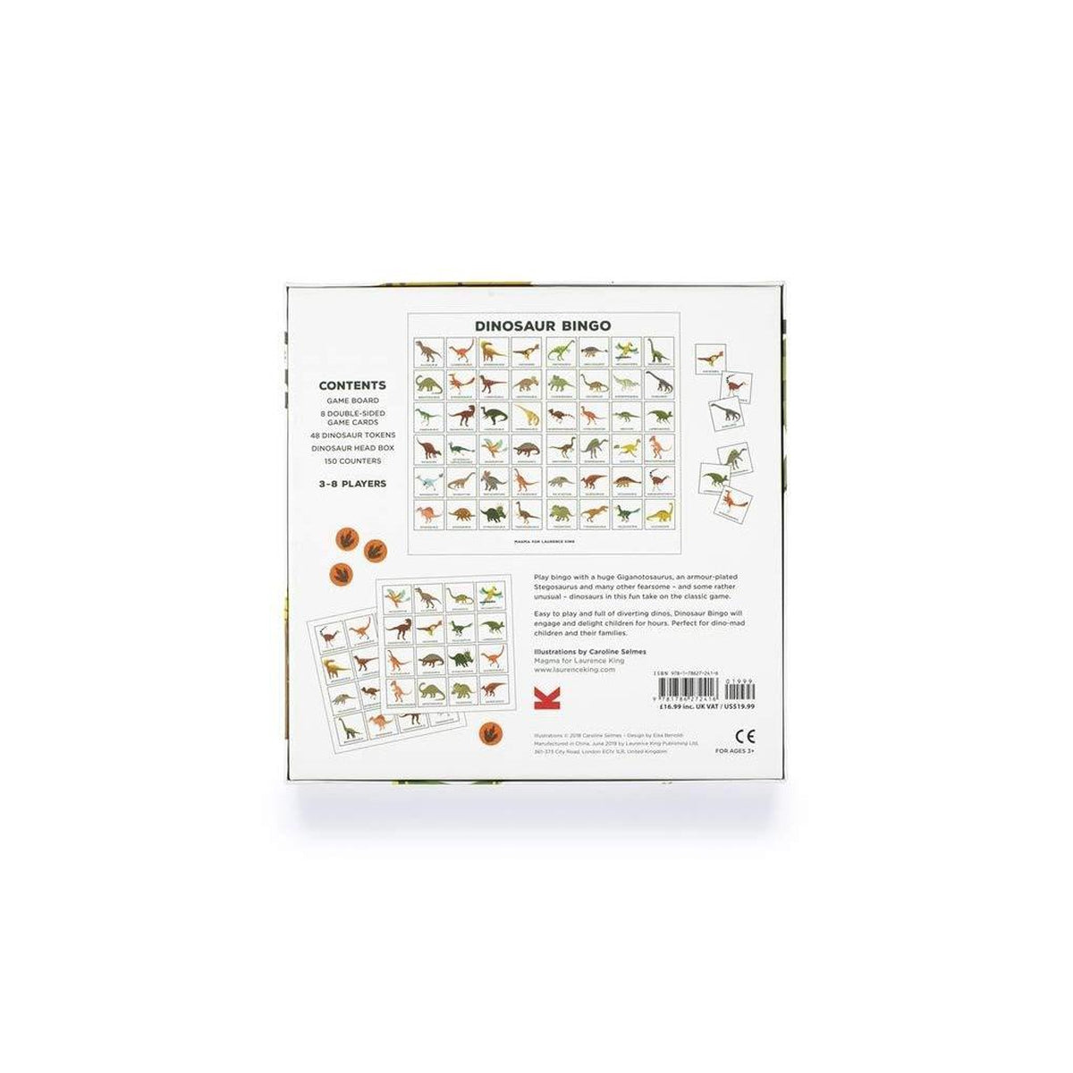 Game contains 48 beautifully illustrated dino tokens as well as a cardboard dinosaur head to store them in, one game board, 8 double-sided bingo cards, and 150 Jurassic counters for you to mark up your card.