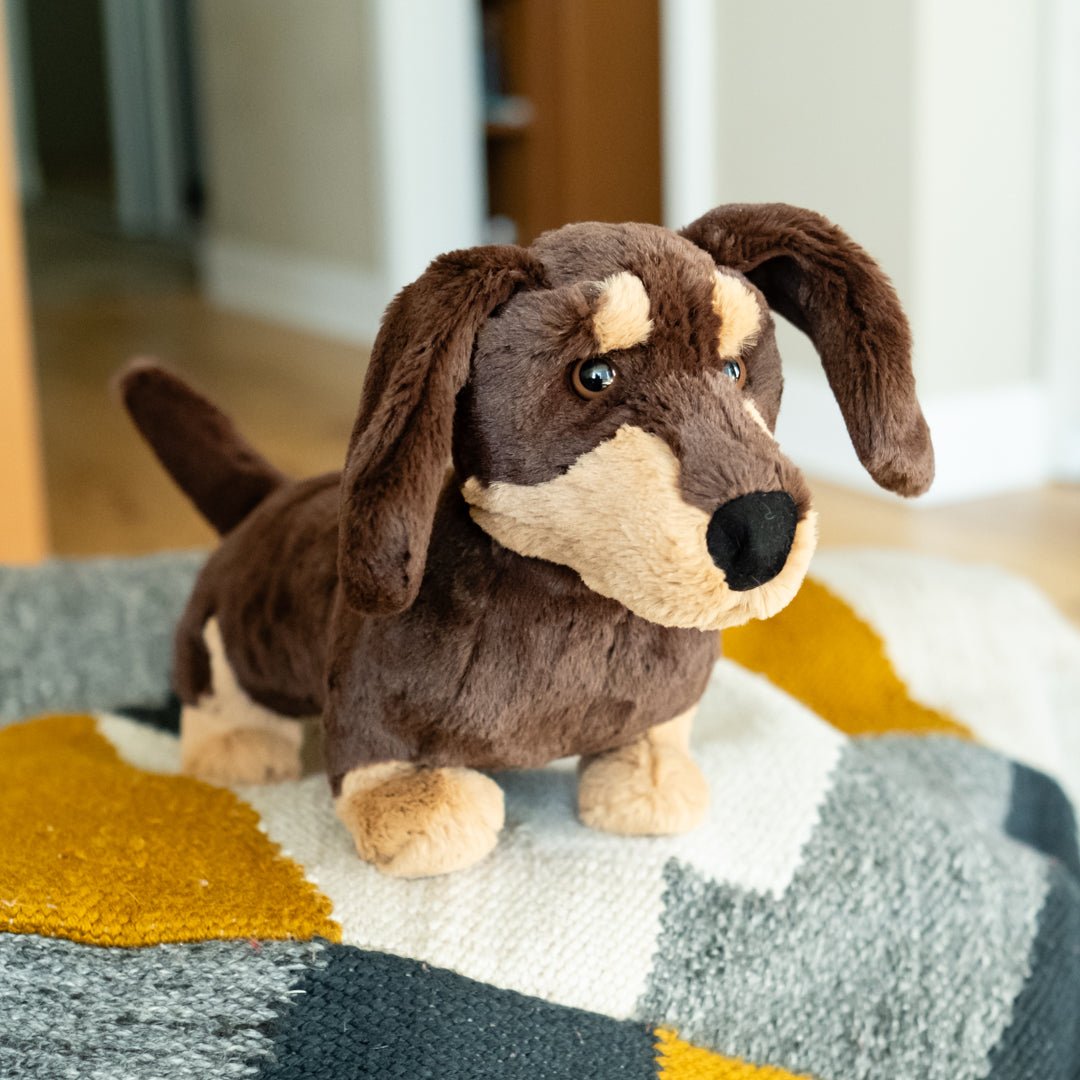 Wiggle, waggle, say hello to the very dashing dachshund Otto! With tiny legs and a great big heart, this intrepid pup has dark chocolatey fur with caramel patches, waggly ears, a perky tail, and expressive golden eyebrows. Bright-eyed little Otto is ready to play!