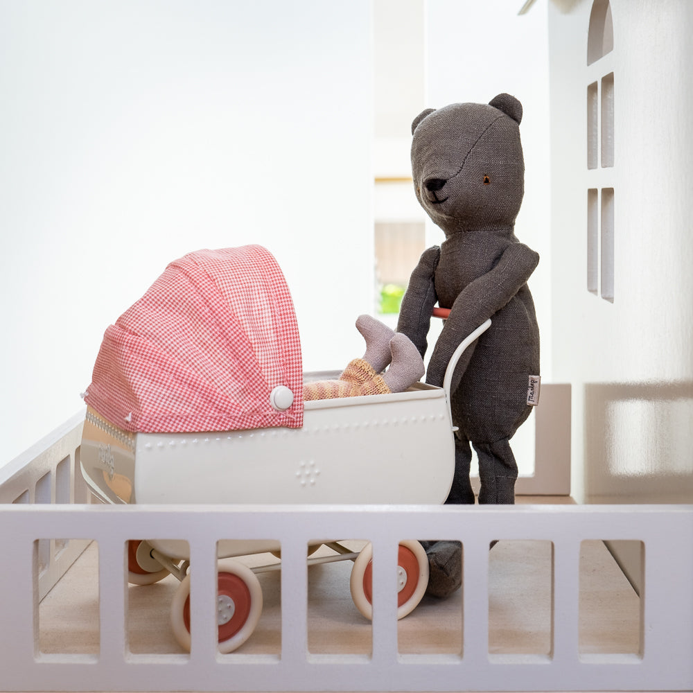 A beautiful Maileg pram with a classic vintage look. The metal body has embossed details on the sides, and the fabric cover is handy to protect your Maileg friends from rain or sun. The pram is perfect for a walk while baby sleeps.