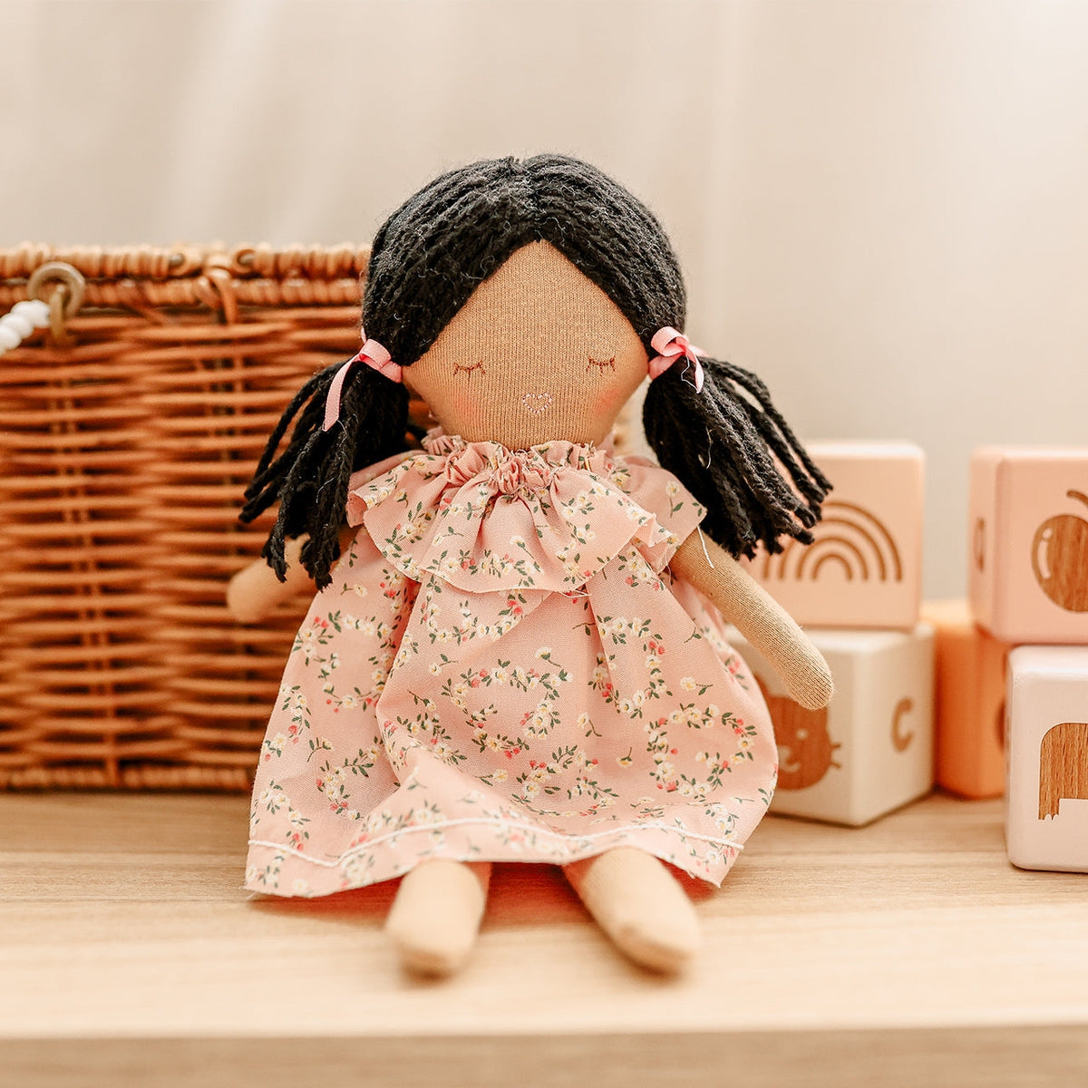 Matilda is a classic reversible doll: on one side Matilda is wide awake and ready to go on adventures, on the other side Matilda is fast asleep and primed for snuggles. Posy Heart Matilda has on a lovely pink floral dress and her black yarn hair is tied back in two ribbon bows.