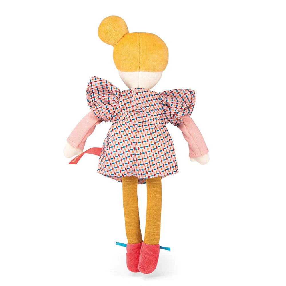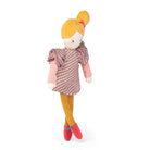 Mademoiselle Agathe is a sophisticated little doll, the height of fashion, who loves strolling around Paris. For the bright days, she has paired a pink puff-sleeve dress dotted with delicate motifs with mustard jersey leggings and wears her hair up in a bun.