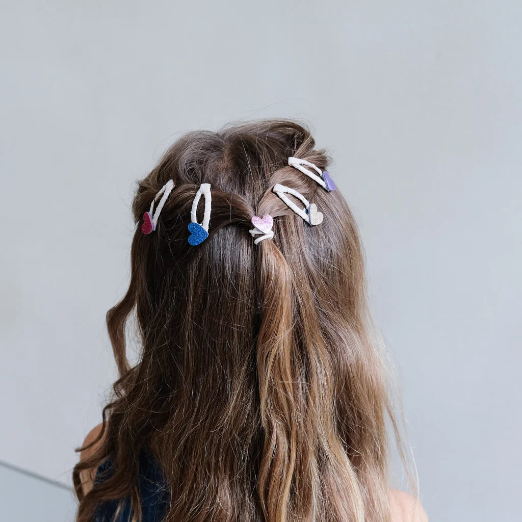 Add a pop of fun loving sparkle with our Jazzy heart mini clic clacs! Featuring colourful hearts crafted from glitter and metallic fabrics, these cute clips will complement any look!